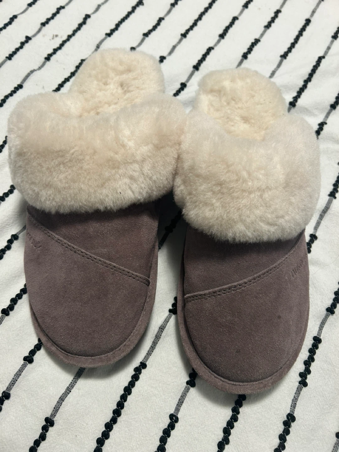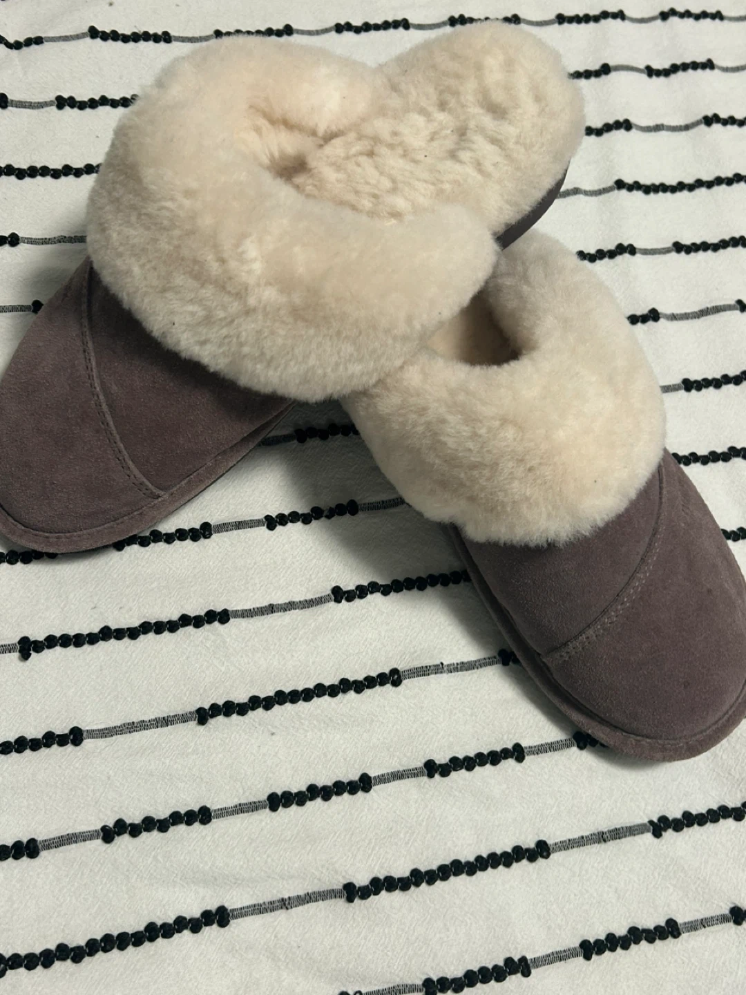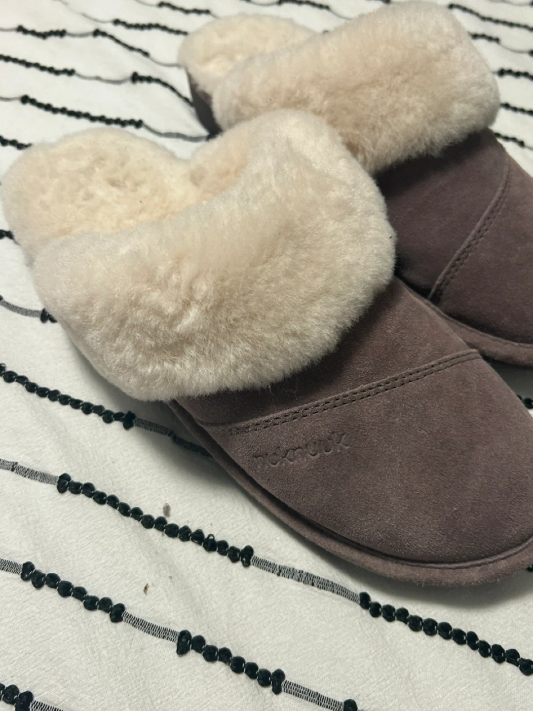 Cozy Mokook slippers in a women's size 11,perfect for keeping your feet warm! The upper part is suede with a plush, fluffy lining. They are in great condition and ready for a new home. I don't have the box or cases. I invite you to view my other items; if you are interested in any of them, I will give you a better price.