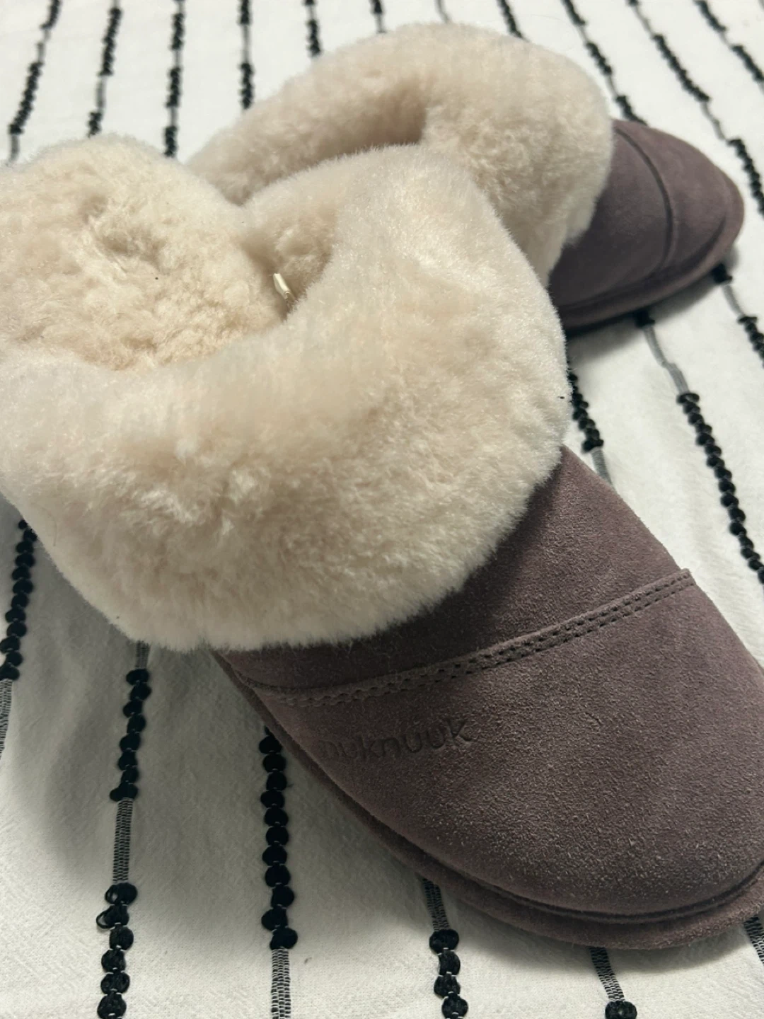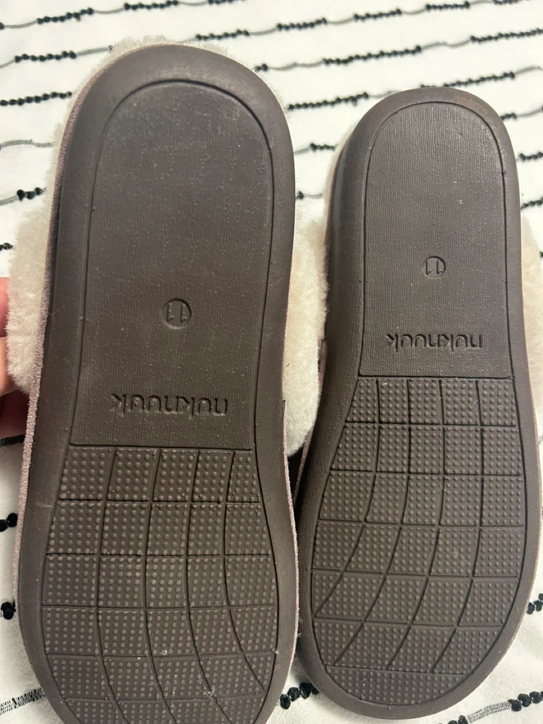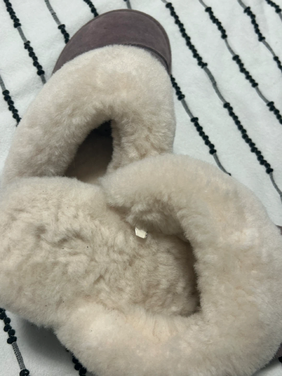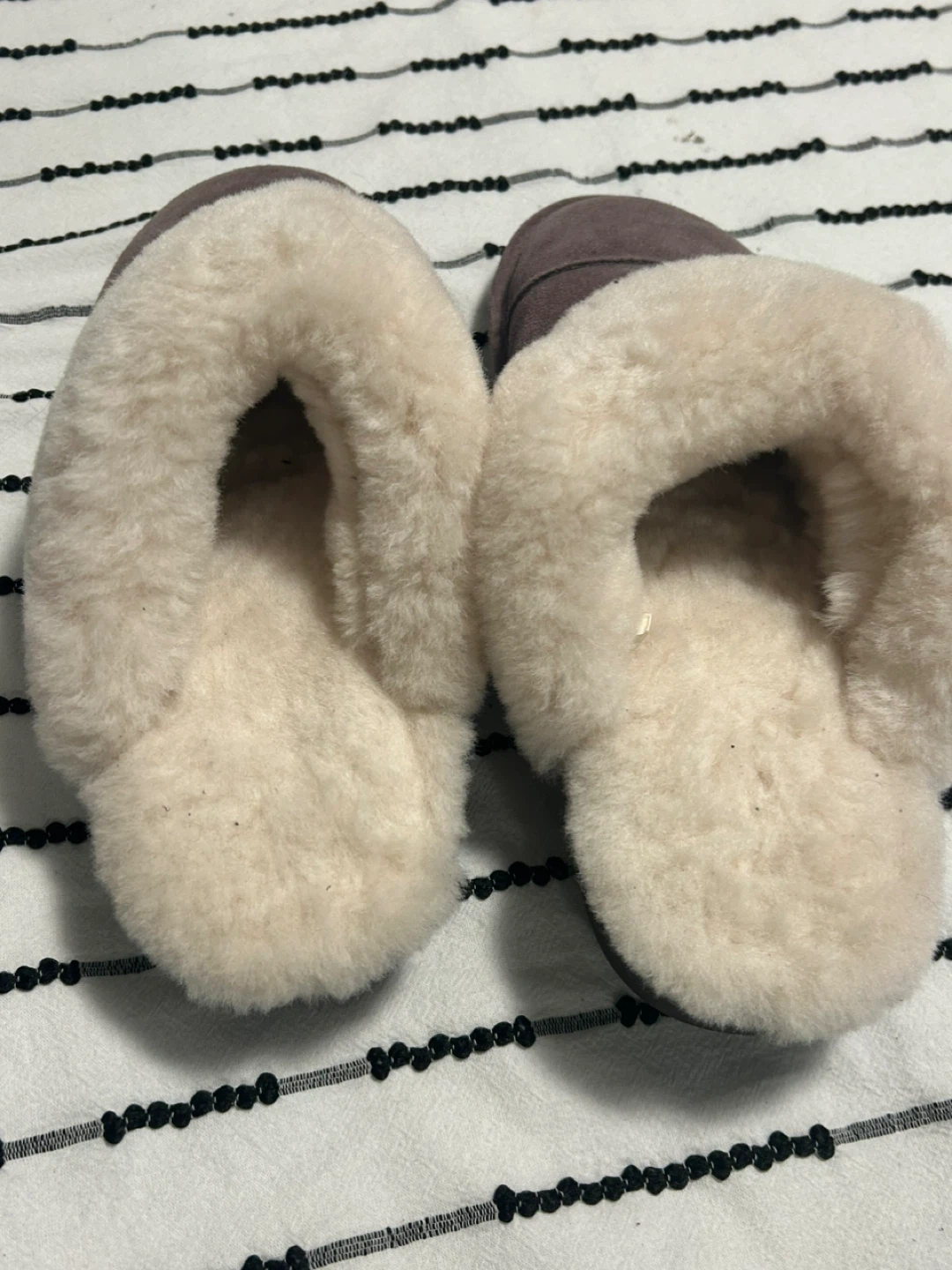 Cozy Mokook slippers in a women's size 11,perfect for keeping your feet warm! The upper part is suede with a plush, fluffy lining. They are in great condition and ready for a new home. I don't have the box or cases. I invite you to view my other items; if you are interested in any of them, I will give you a better price.