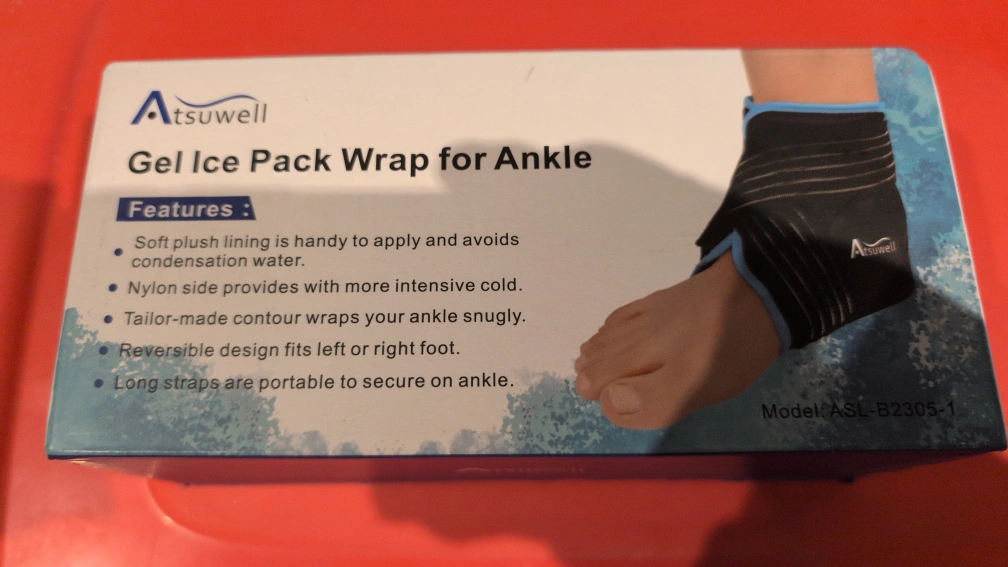 I have an Atsuwell Gel Ice Pack Wrap for Ankle. It has a soft plush lining and a nylon side for more intensive cold. The tailor-made contour wraps your ankle snugly, and it's reversible for either foot. Long straps make it portable and easy to secure on your ankle. Model: ASL-B2305-1