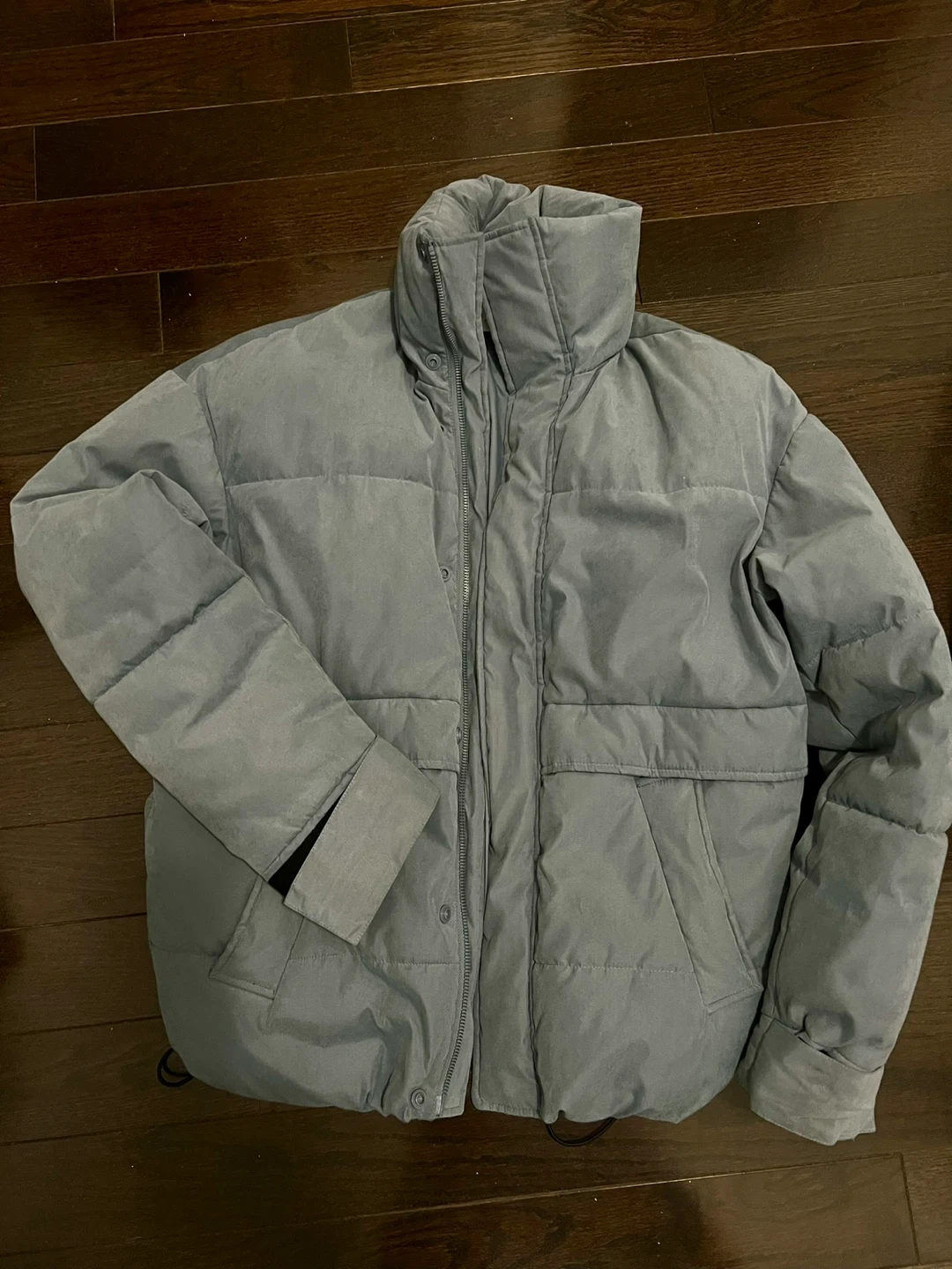 Zara puffer in a greyish-blue shade. No hood. Double pockets and Velcro adjustable arm cuffs. Bottom is also adjustable with ties. Measures 22” pit-to-pit and 28” front shoulder to the bottom.