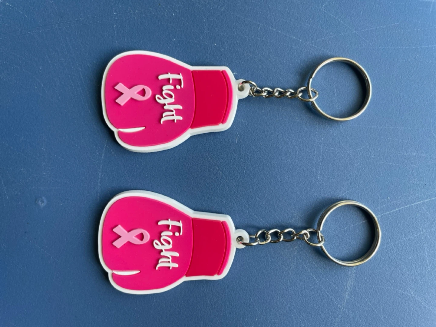Selling a set of two pink boxing glove keychains. They have a cute design with the word 'Fight' and a pink ribbon, perfect for showing support or adding a pop of colour to your keys!