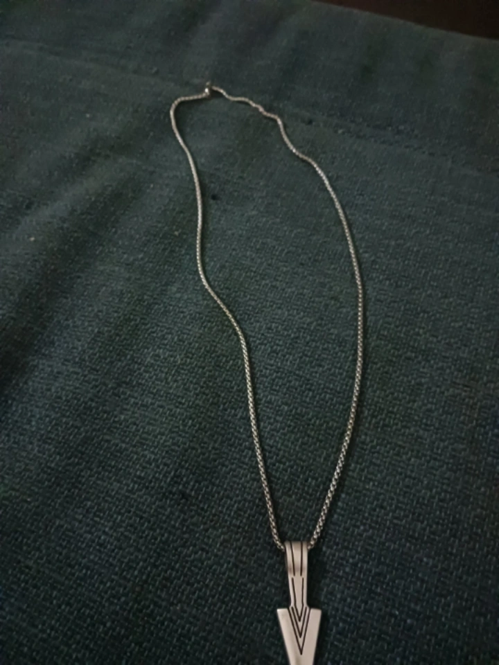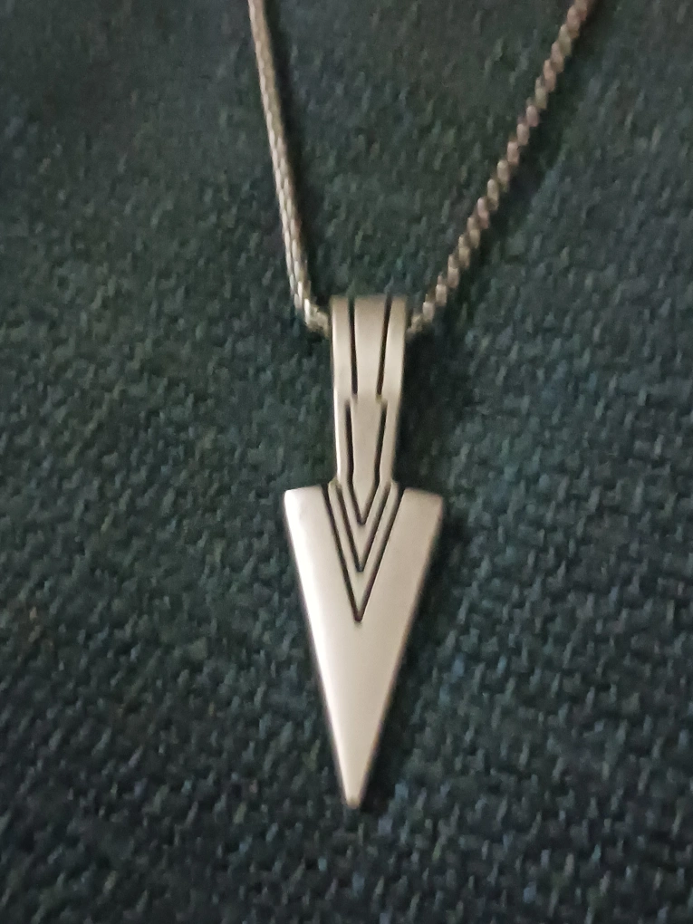 540Selling a silver-tone arrowhead pendant necklace. It's in great condition and would make a nice addition to any outfit. The pendant has a sleek, modern design. The chain is a delicate, yet sturdy, snake chain.