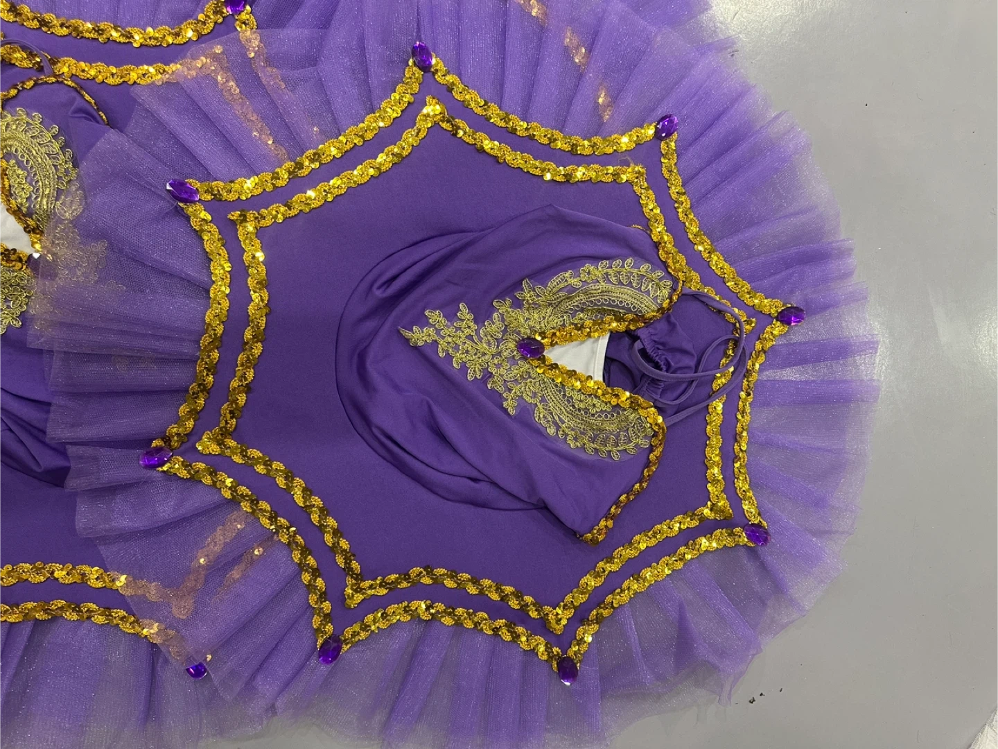 Selling a purple tutu with gold trim. It has a layered tulle skirt and a comfortable bodice. Perfect for dance performances or costumes!