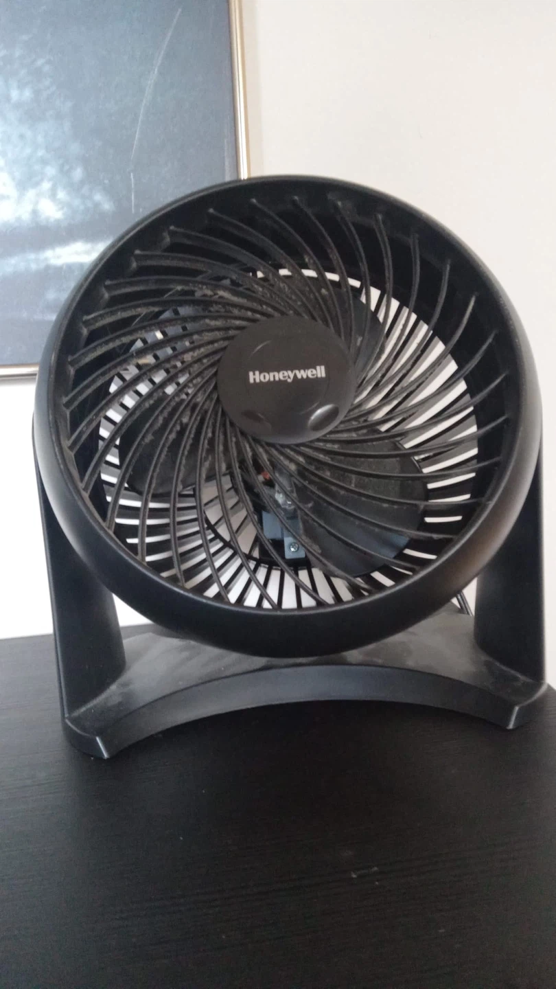 This is a Honeywell table fan in black. It's a great way to keep cool on a hot day. It shows some signs of use, but is still in good working condition!