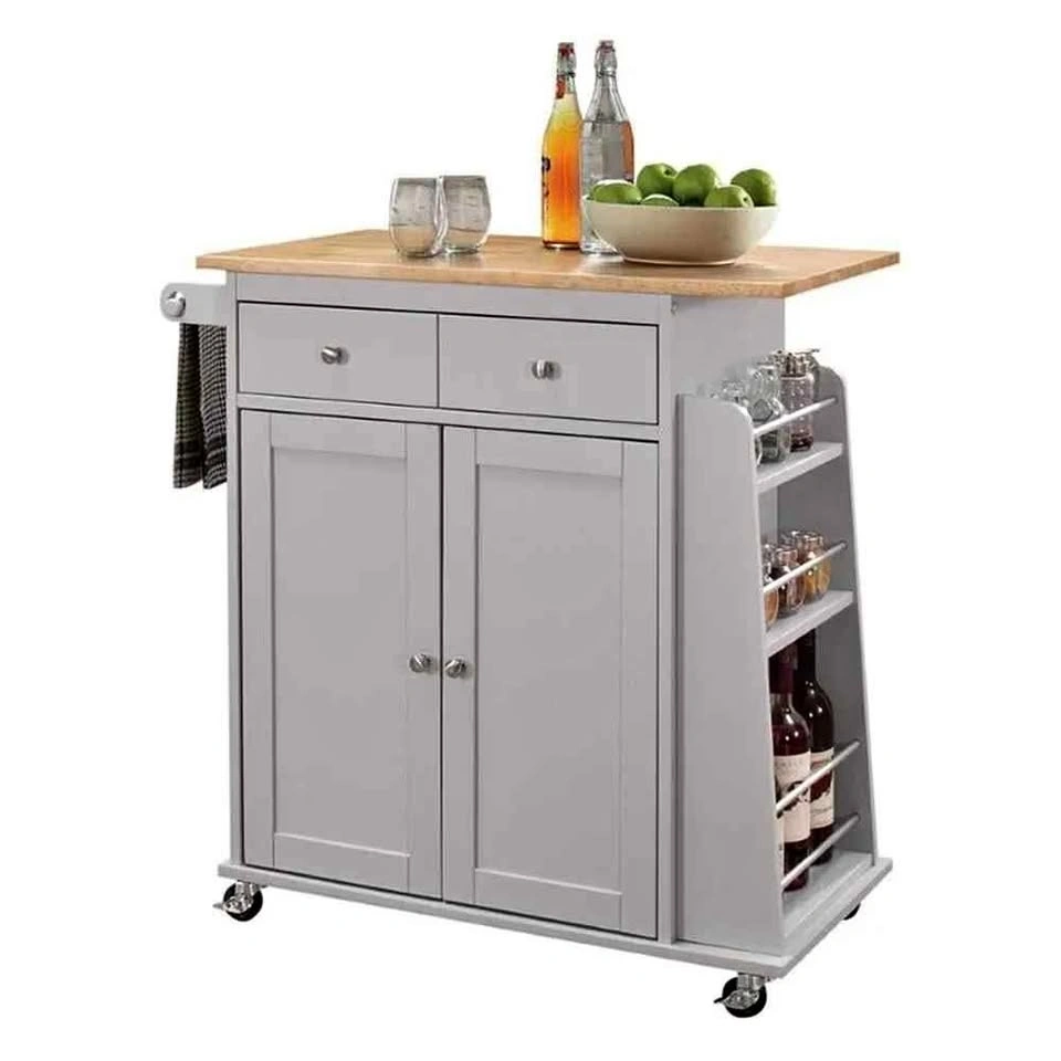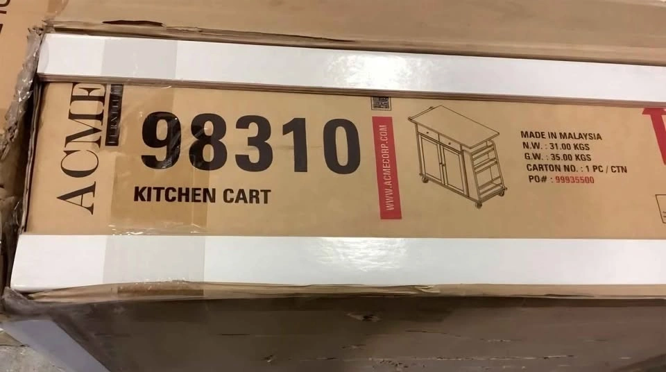 Brand new kitchen Island cart. It comes unassembled in original sealed never-opened box with all manufacturer parts and hardware for easy assembly. Retails at Wayfair for $819 + tax. Save your money. For detailed specs Google (Sku:C[hidden information]) Acme Furniture Tullarick 98310 Wheeled Kitchen Island Cart with Spice, Towel Rack, 2 Drawers, and Shelves, Natural and Gray Features: Rectangular Kitchen Cart: A spacious, rectangular kitchen cart provides ample surface area for food prep and serving. Wooden Top: Sturdy wooden top offers a durable and stylish surface, perfect for cooking or displaying items. 2 Doors & 2 Drawers: Includes two doors and two drawers for convenient storage of kitchen essentials and utensils. Caster Wheels Included: Caster wheels allow for easy mobility, making the cart versatile and easy to move around. Spice & Towel Rack: The integrated spice and towel rack keeps essentials within reach, adding practicality and convenience. Natural & Grey Finish: Natural and grey finishes provide a neutral colour scheme that complements various kitchen styles and themes. Contemporary Style: Contemporary style design adds a sleek, modern look to any kitchen or dining area. Some assembly required.
