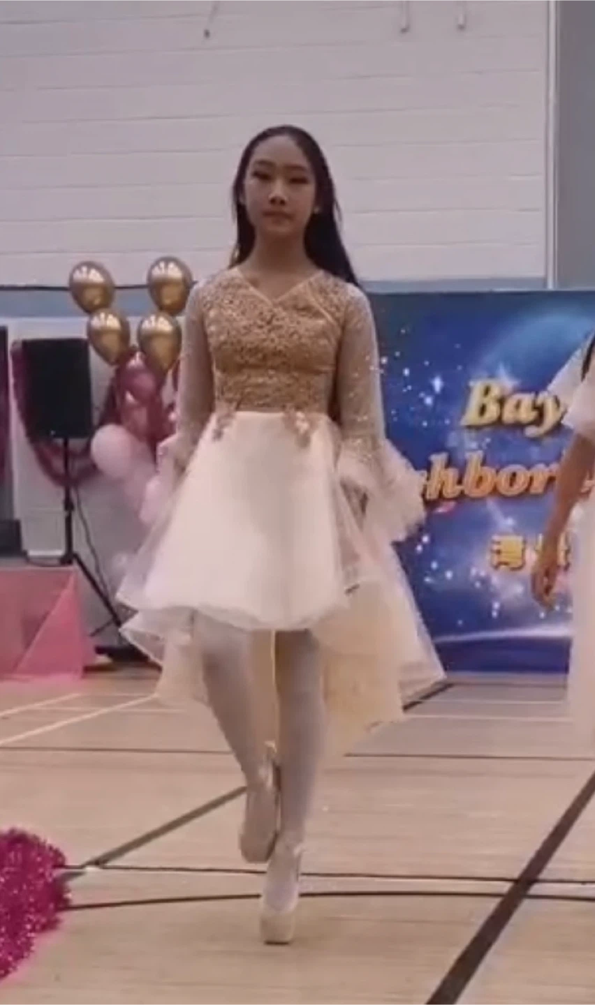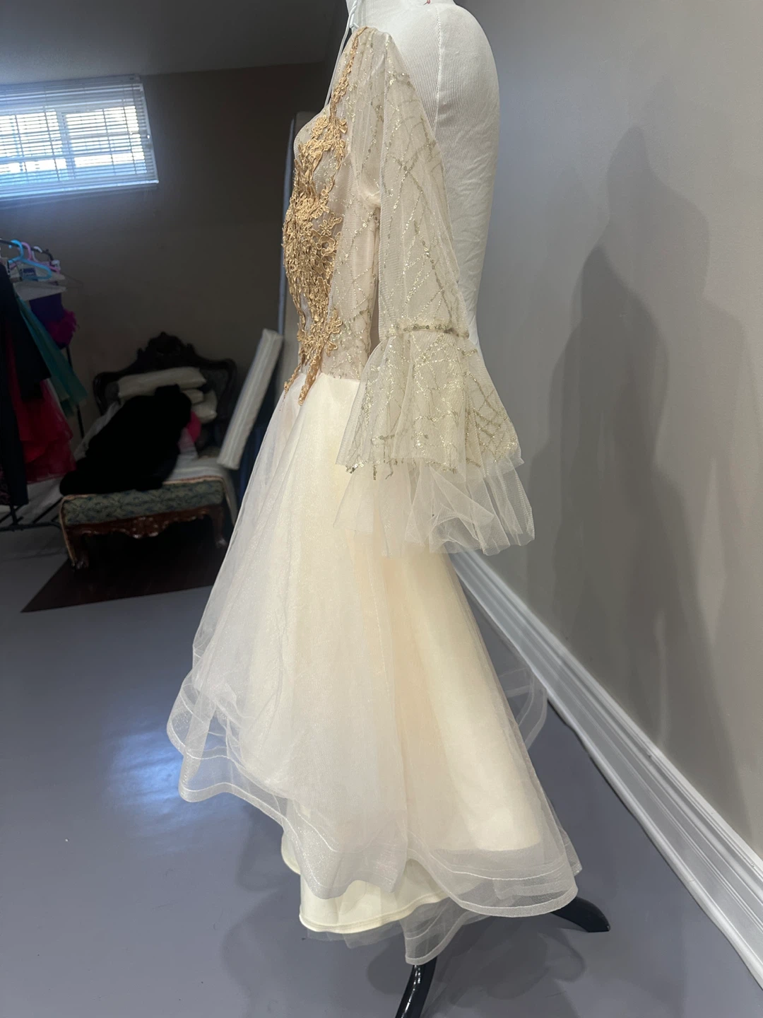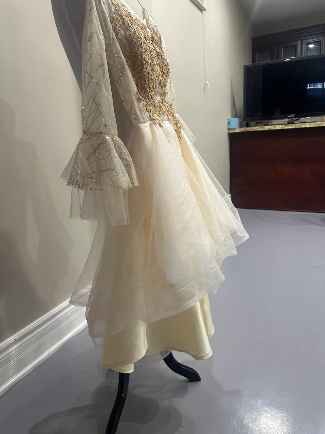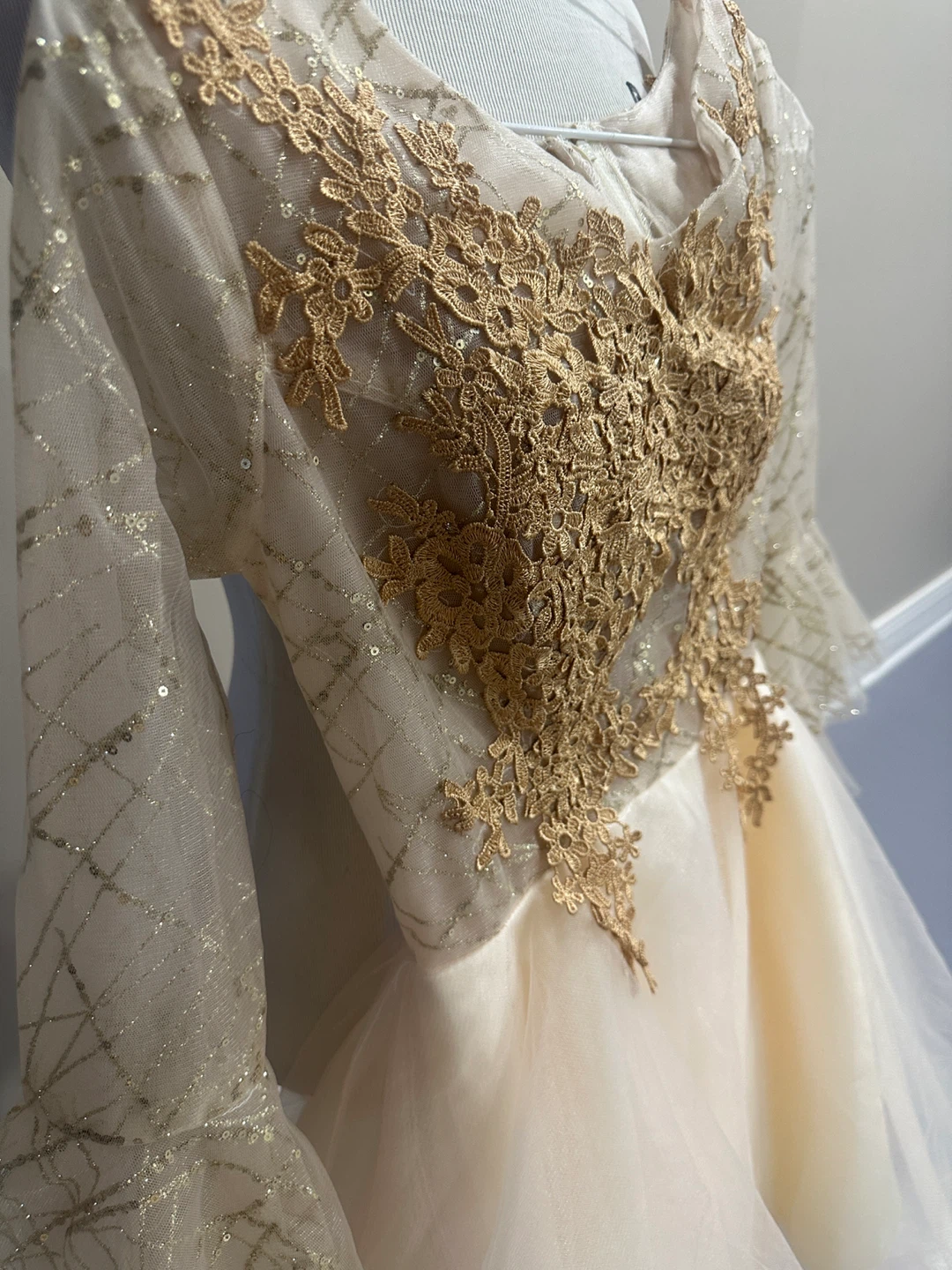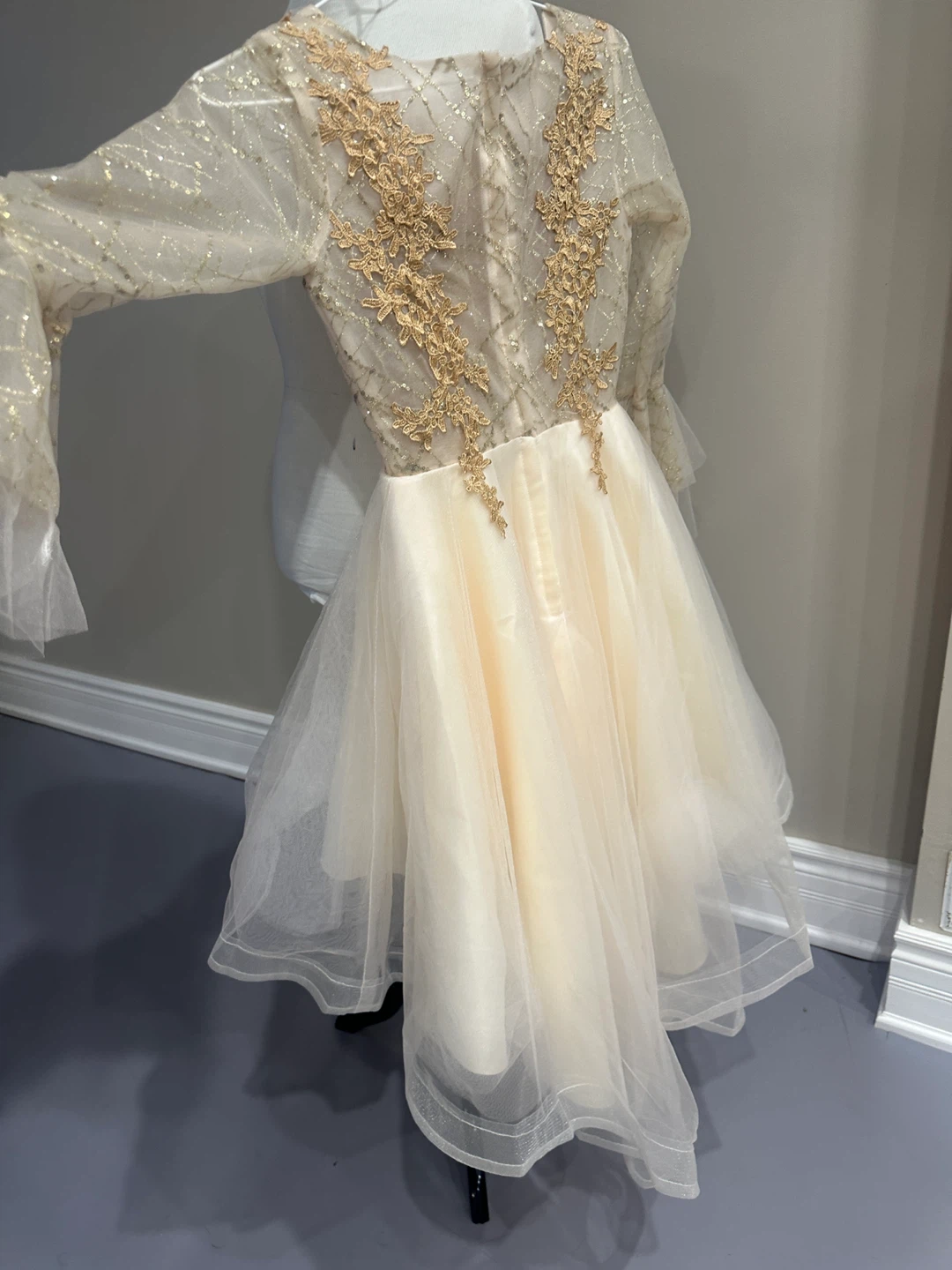 Selling a beautiful girl's dress, perfect for a special occasion! The dress features a cream-coloured skirt and a gold-coloured, lace-detailed bodice with long sleeves. It's in great condition and ready for a new home