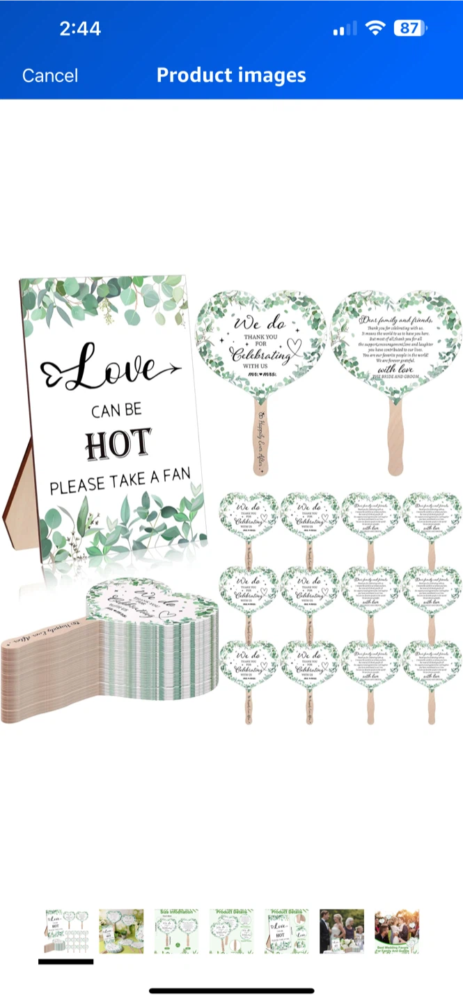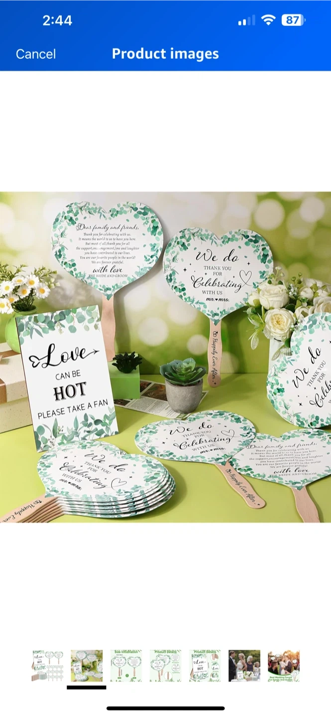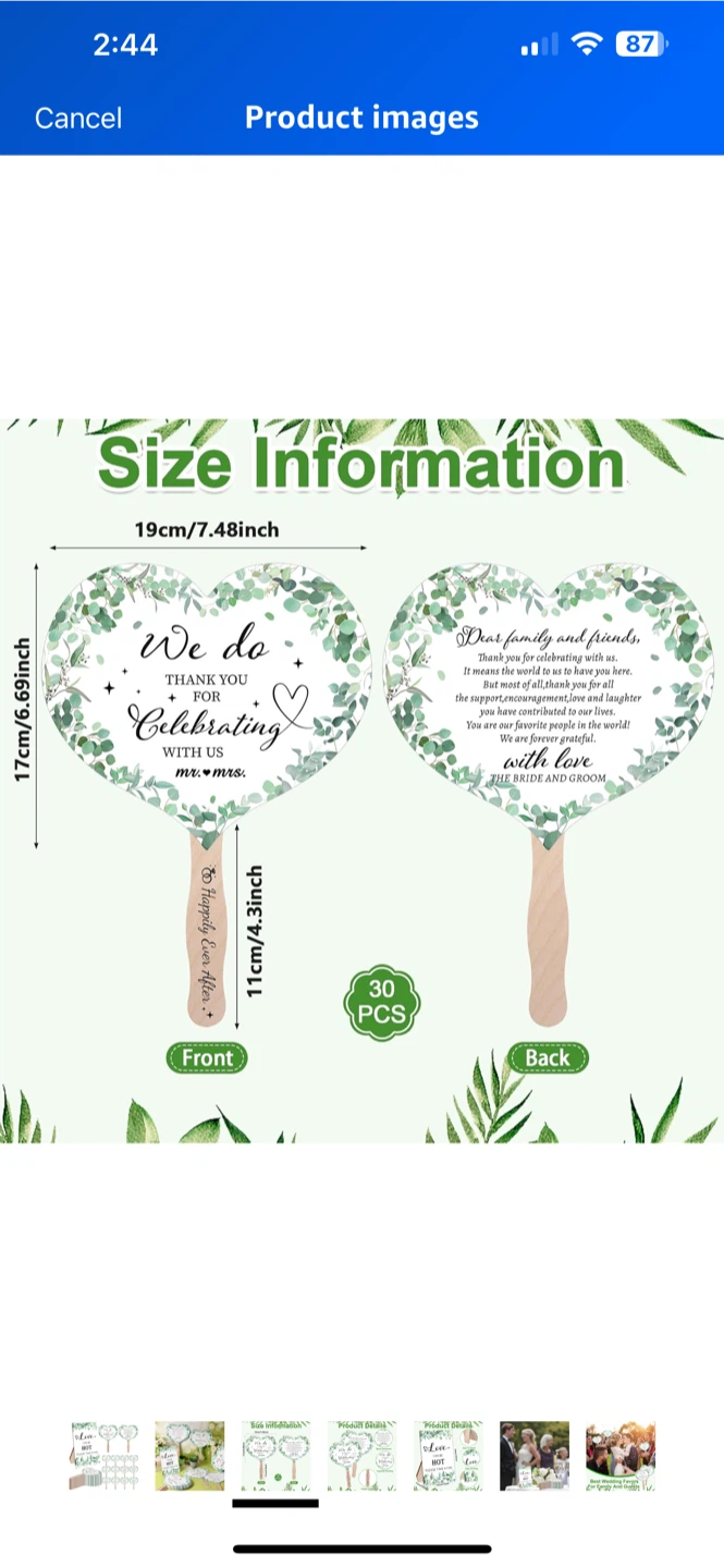 Selling a set of 30 wedding hand fans! Perfect for keeping your guests cool and comfortable during outdoor ceremonies or receptions. Each fan features a lovely heart shape with a leafy design and the words "We do, thank you for celebrating with us, Mr. & Mrs.". They're approximately 19cm wide and 17cm tall, with a wooden handle.