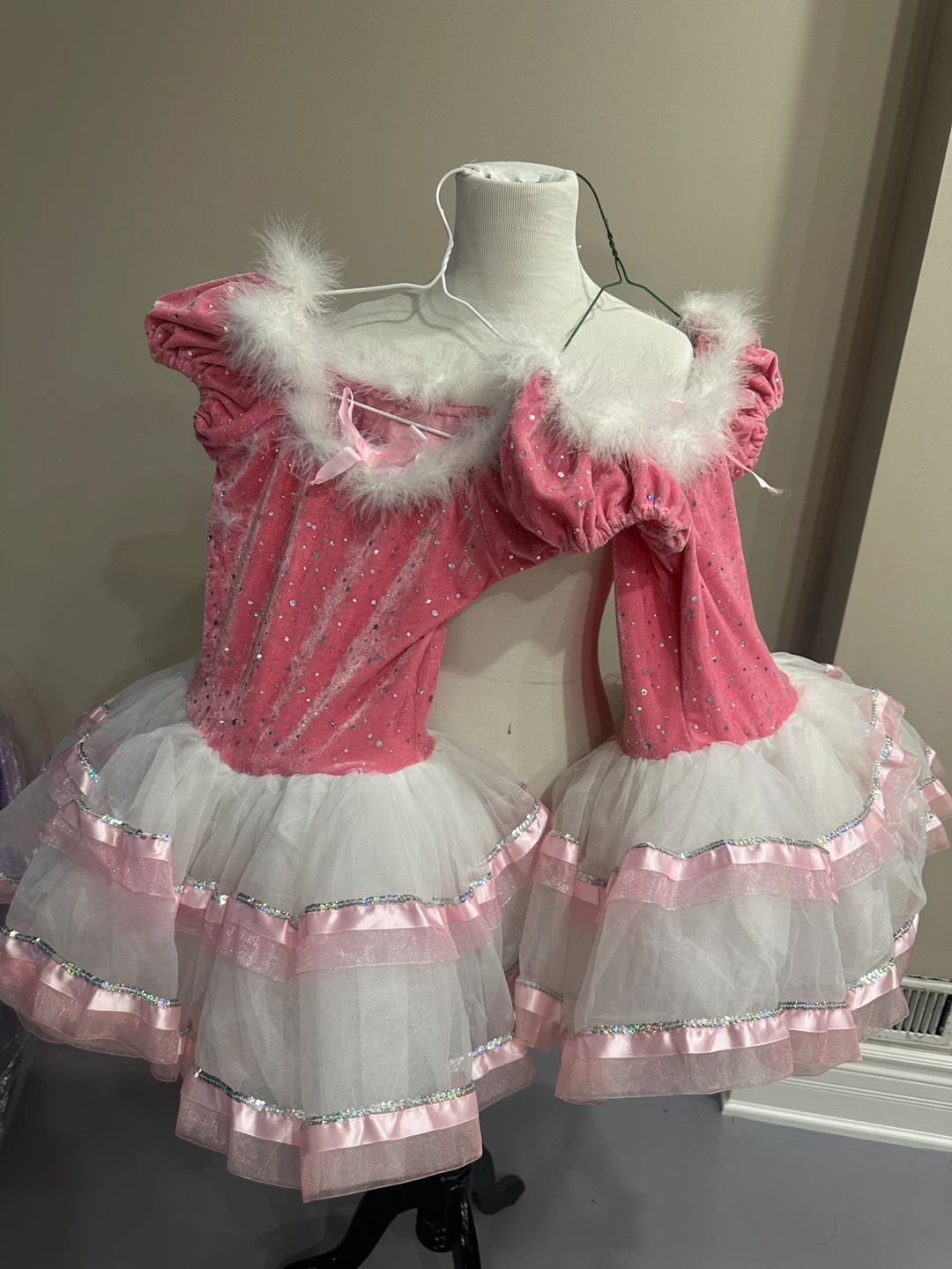 Selling a cute pink and white tutu costume! It features a sparkly pink bodice with white faux fur trim and a multi-layered white tulle skirt with pink ribbon accents. Perfect for dance class or dress-up!