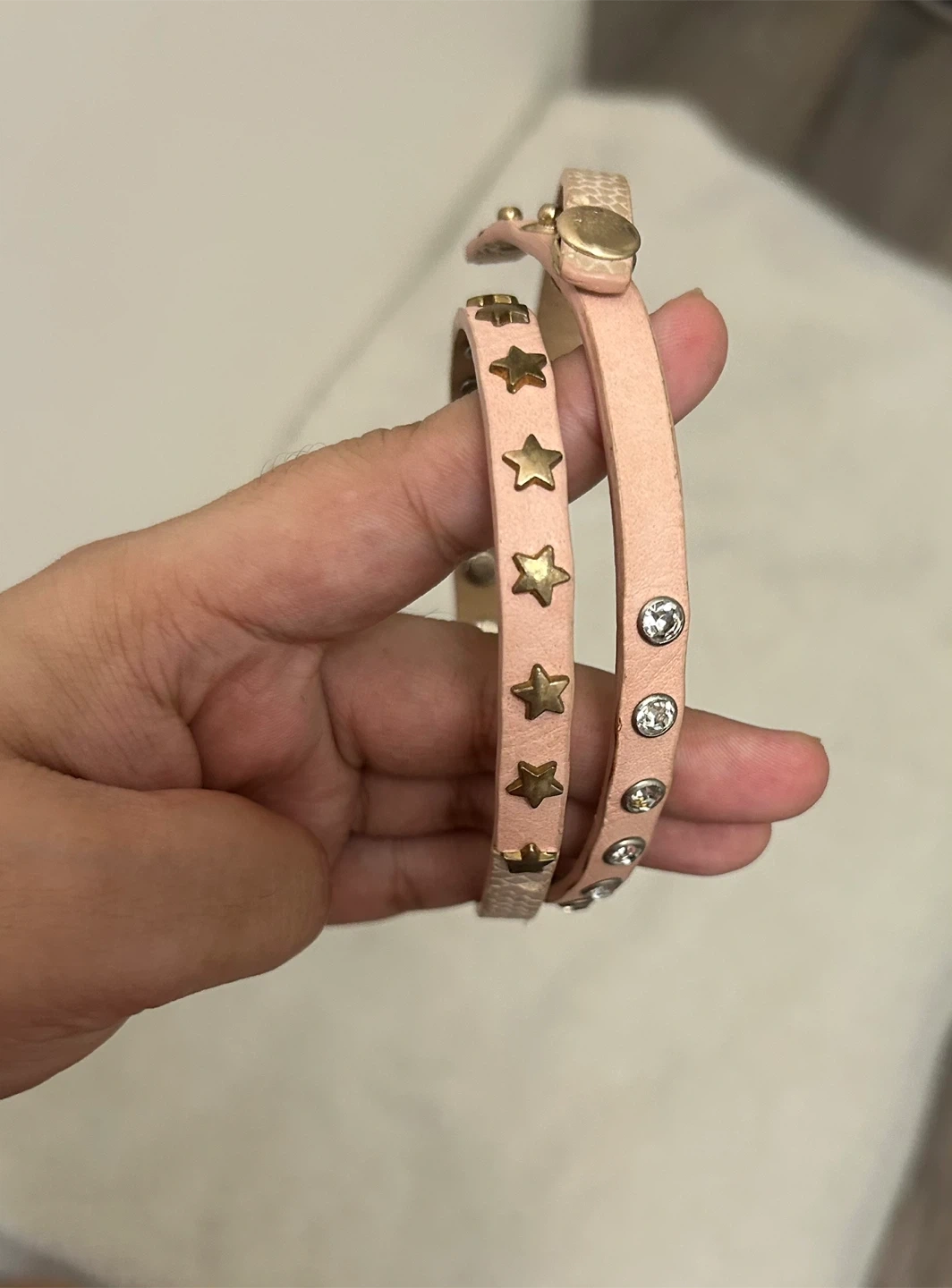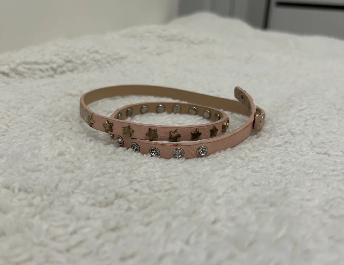 This is a cute wrap bracelet! It's a light pink colour with gold stars and rhinestones. It would be a great addition to any outfit!