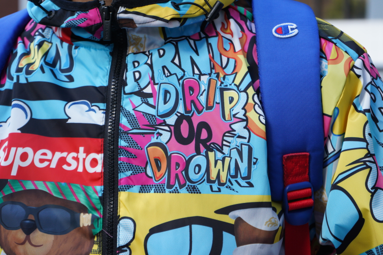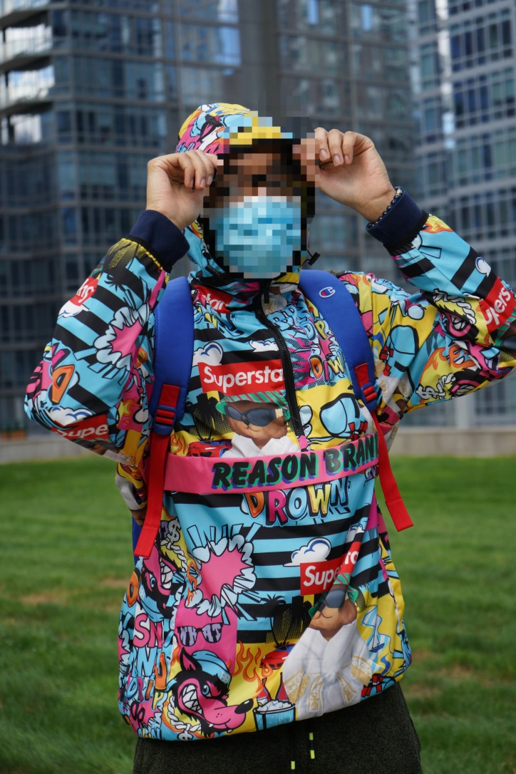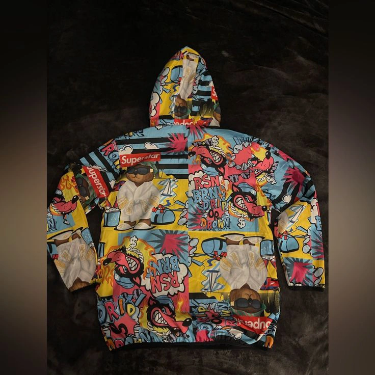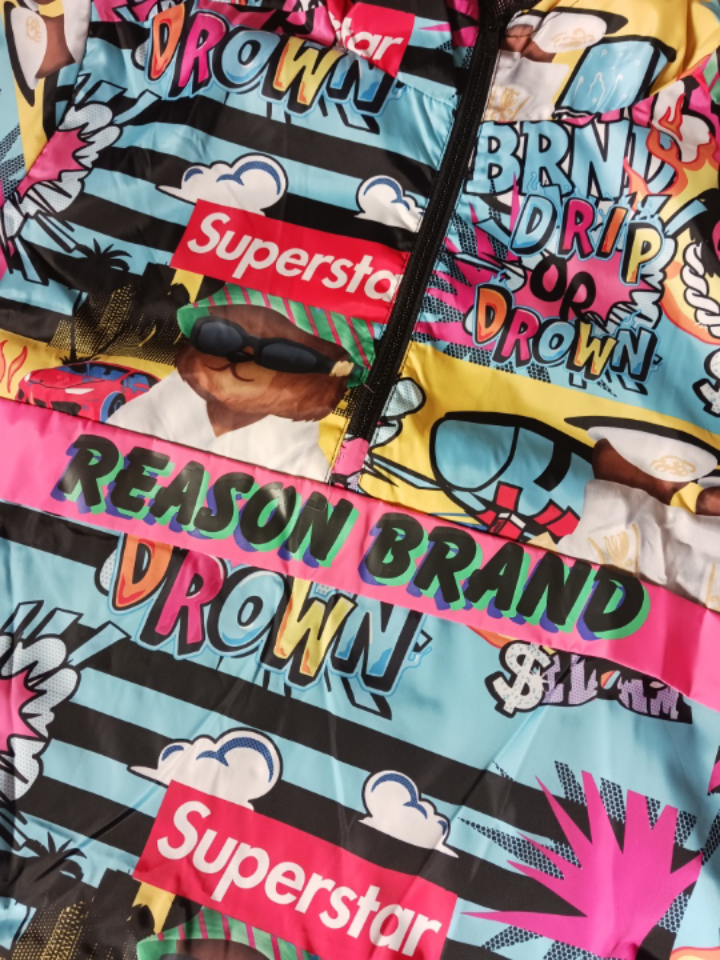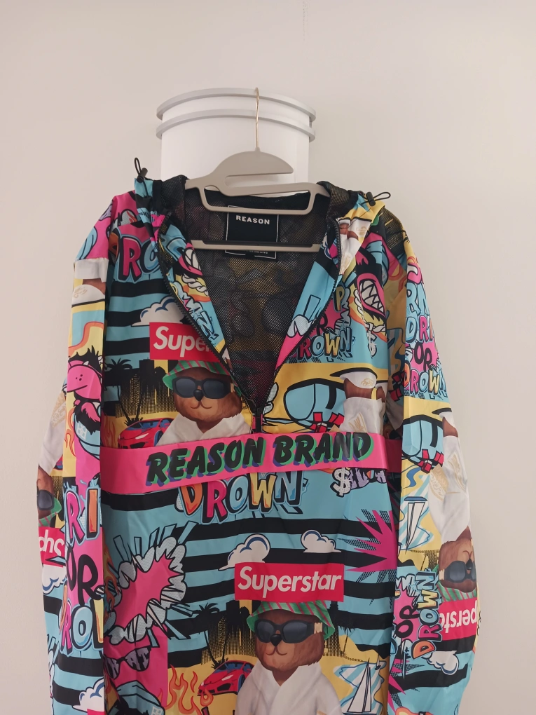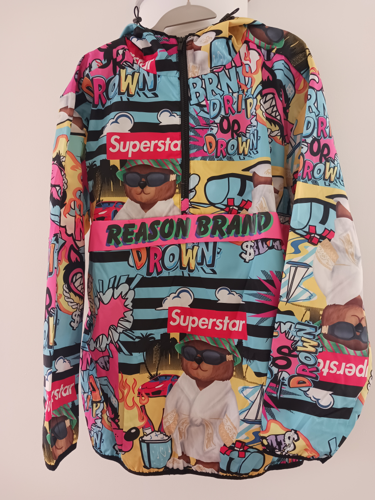 Make a bold statement with this Reason Brand Superstar Bear Windbreaker. Featuring an eye-catching all-over graphic print, this limited edition jacket blends street style with collectible design. Lightweight and comfortable with a 1/4 zip and hood β perfect for everyday wear or standout fits.