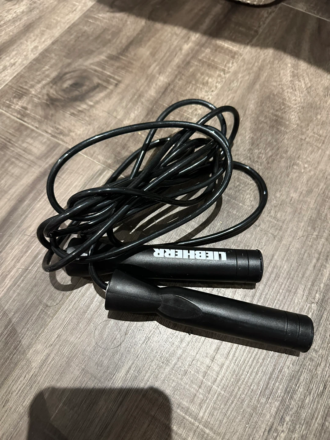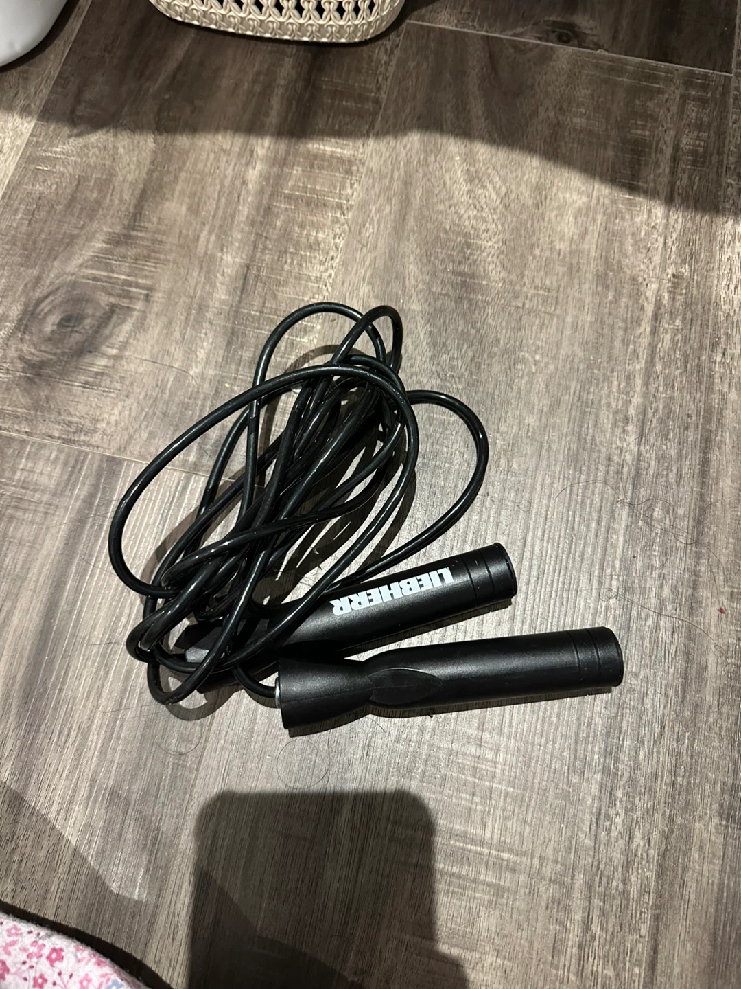 Selling a jump rope in black. It's in great condition and ready for your next workout! Perfect for cardio and improving your fitness.