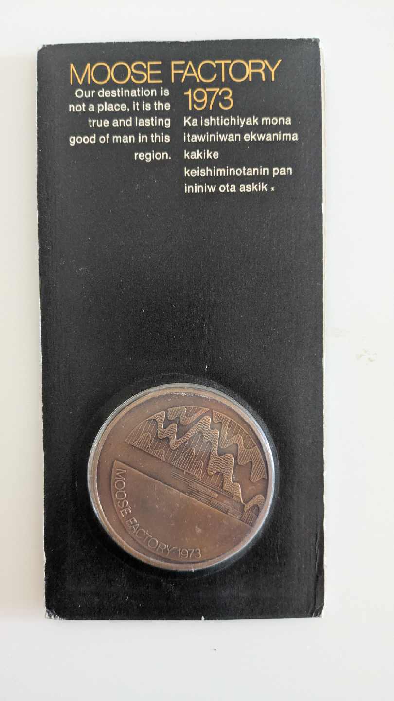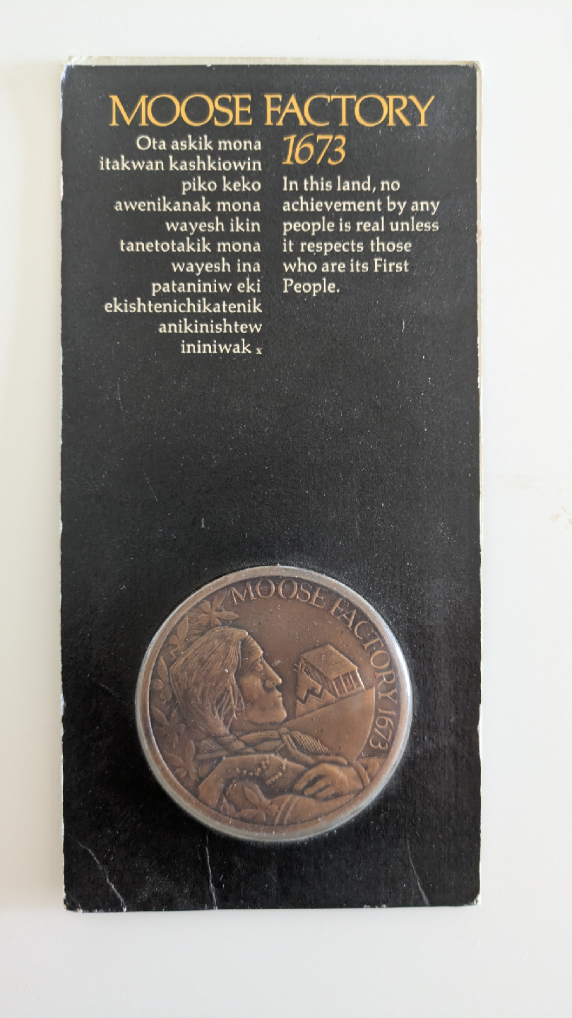 1673-1973 anniversary bronze medal commemorating Hudson Bay Company Moose Factory fur trading post established on traditional Cree Nation lands in northern Ontario, Canada.
