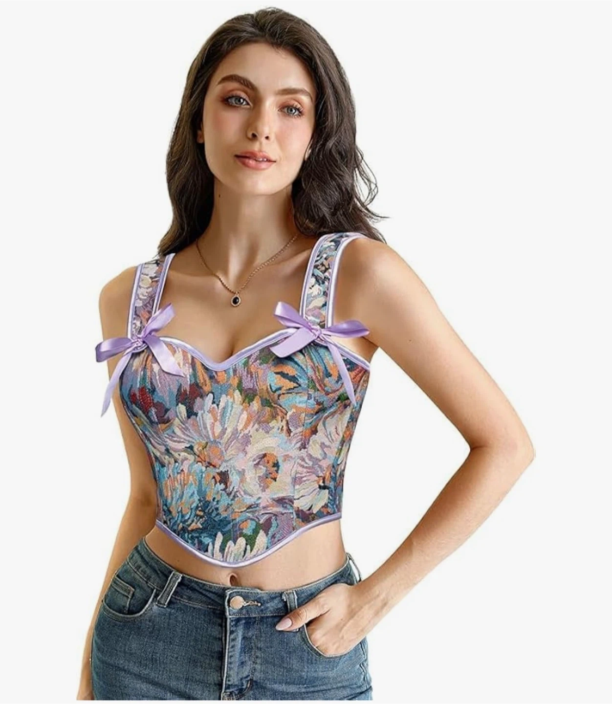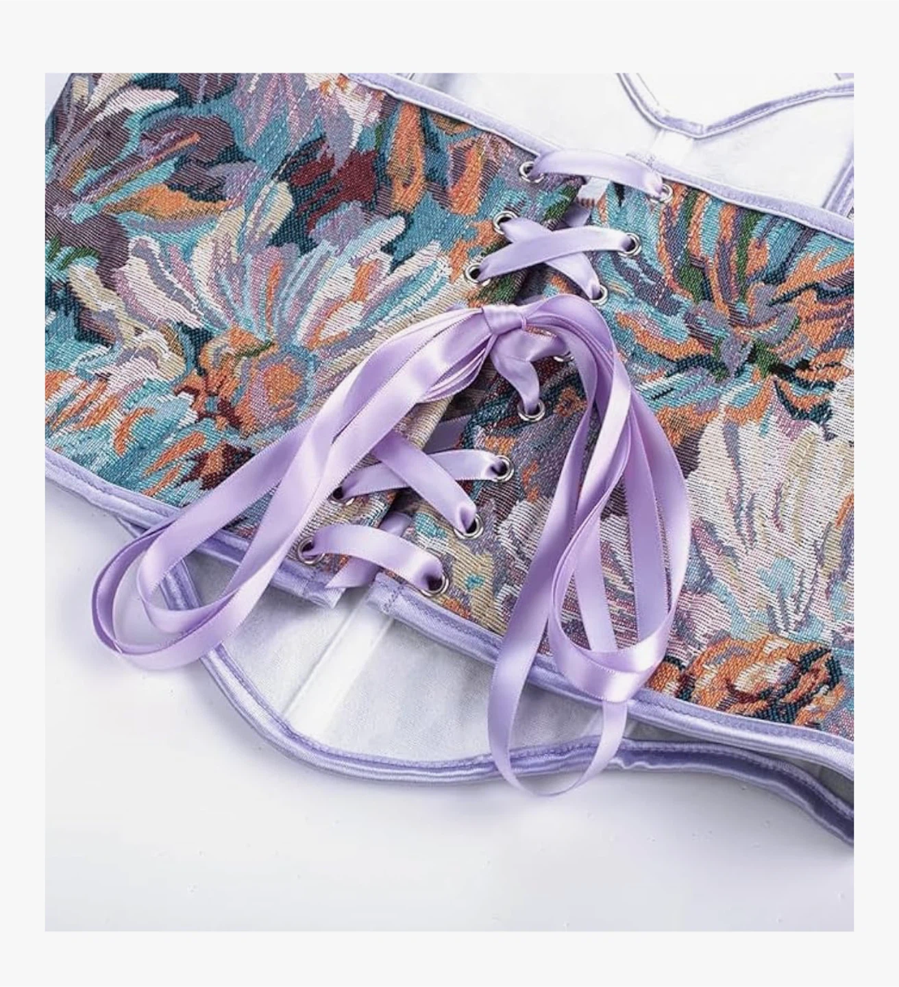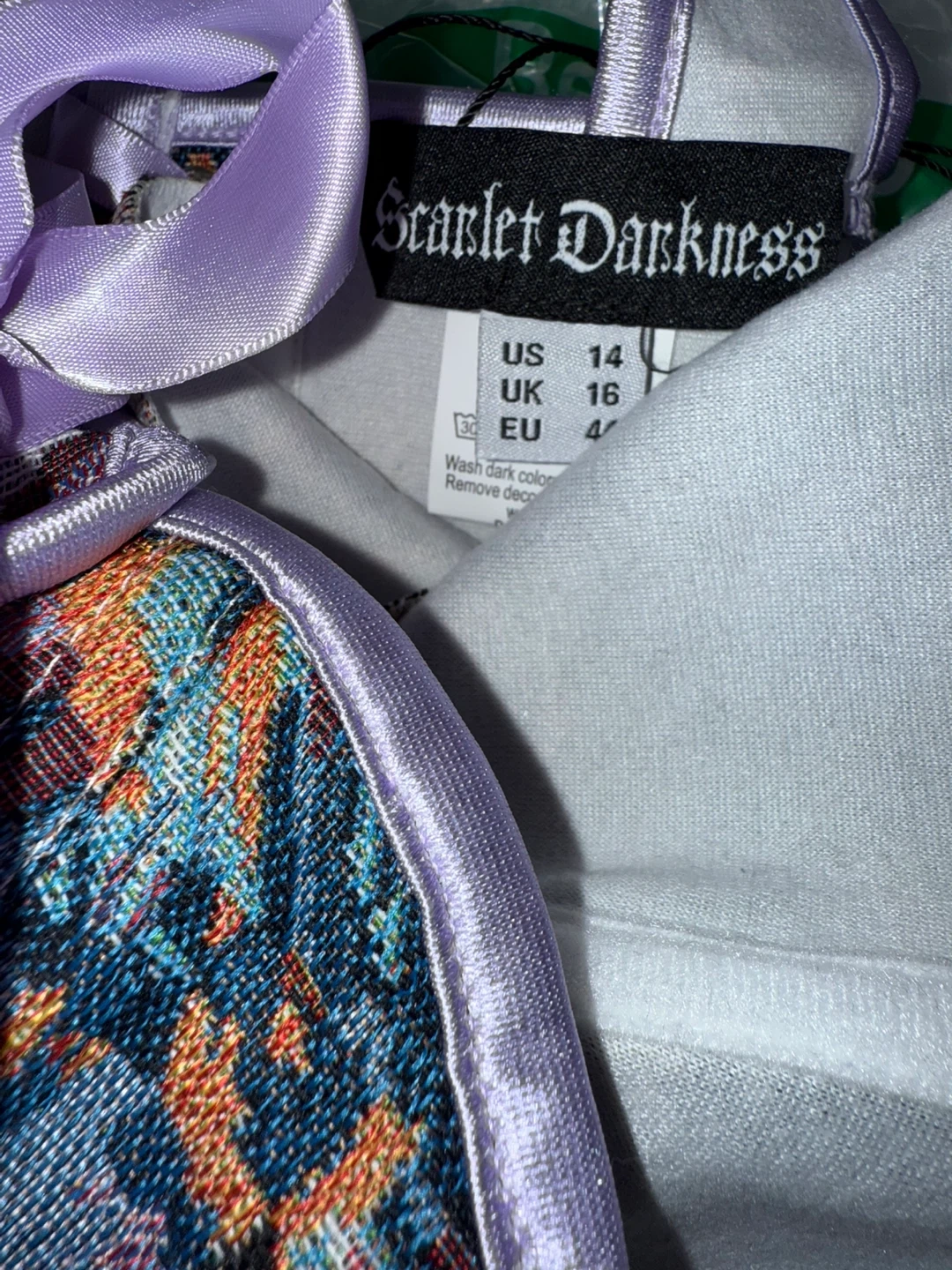 Selling a beautiful floral corset top from Scarlet Darkness! It's a size US 14, UK 16, and EU 42. The corset has a unique tapestry-like floral pattern with lovely purple ribbon details. Perfect for adding a touch of elegance to any outfit