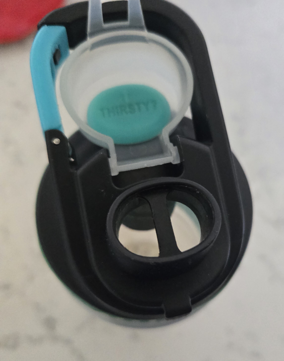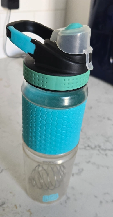 Cool Gear Shaker bottle perfect for protein shakes or just keeping your water interesting. The bottle is aqua blue with a black lid and a clear body, so you can see how much liquid is left. It also has a convenient carrying handle.