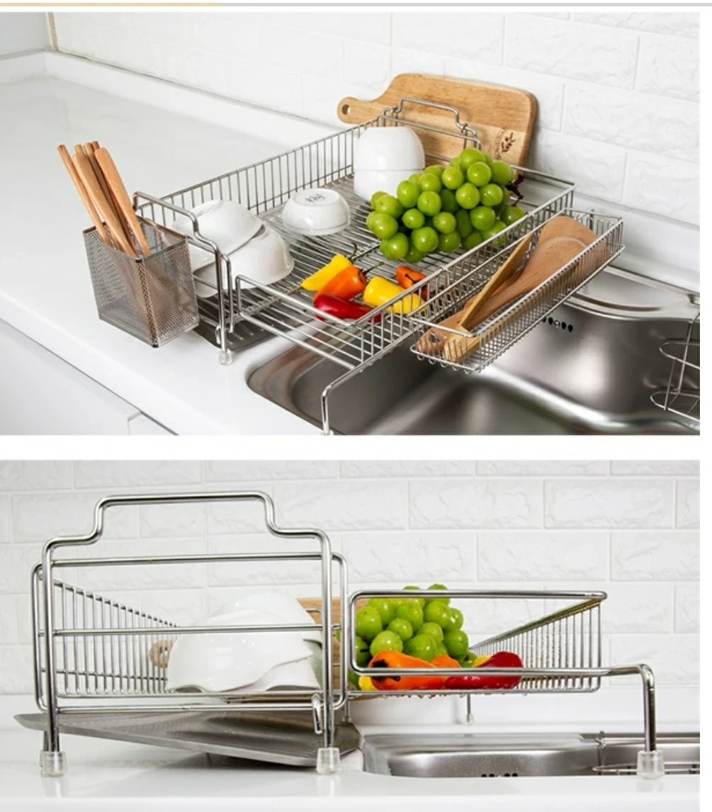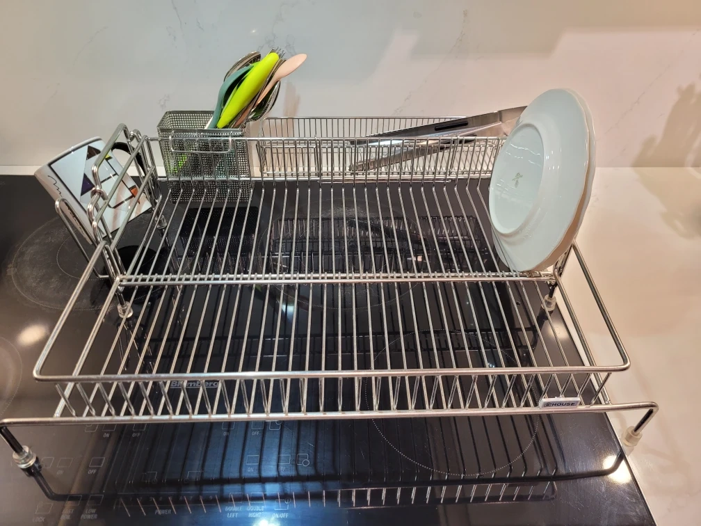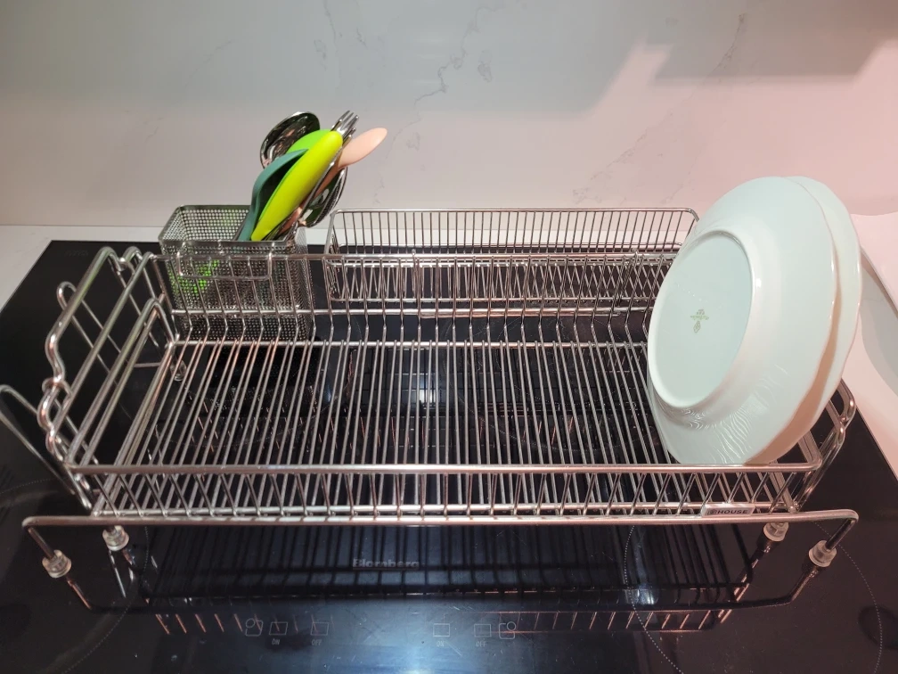 This is a sturdy stainless steel dish drying rack, perfect for keeping your dishes organized and dry! It features a separate compartment for cutlery and ample space for plates, bowls, and other kitchen items. Great condition like a new one ! 304 stainless steel Made in Korea