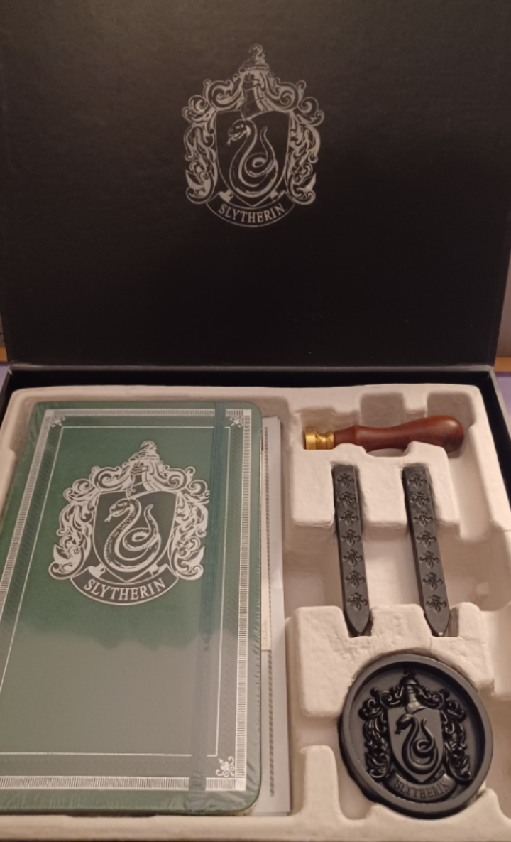 Selling a Harry Potter Slytherin stationery set! It comes in the original box and includes all the components as pictured: stationery paper, wax sticks, a seal, and a notebook. Perfect for any Harry Potter fan!