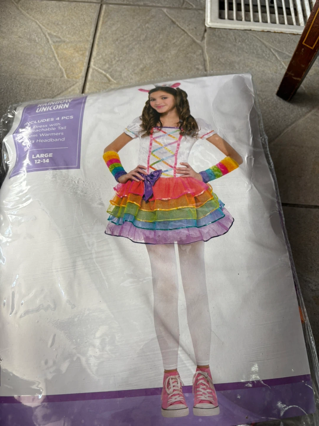 Selling a Rainbow Unicorn costume, size large (12-14). The costume includes 4 pieces: a dress with a detachable tail, arm warmers, and a headband. Perfect for dress-up or Halloween!