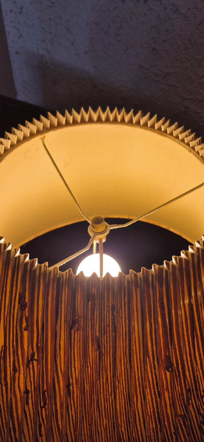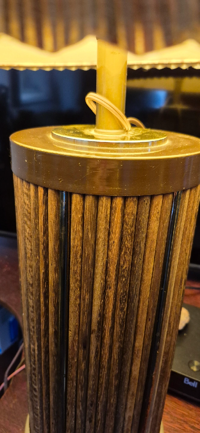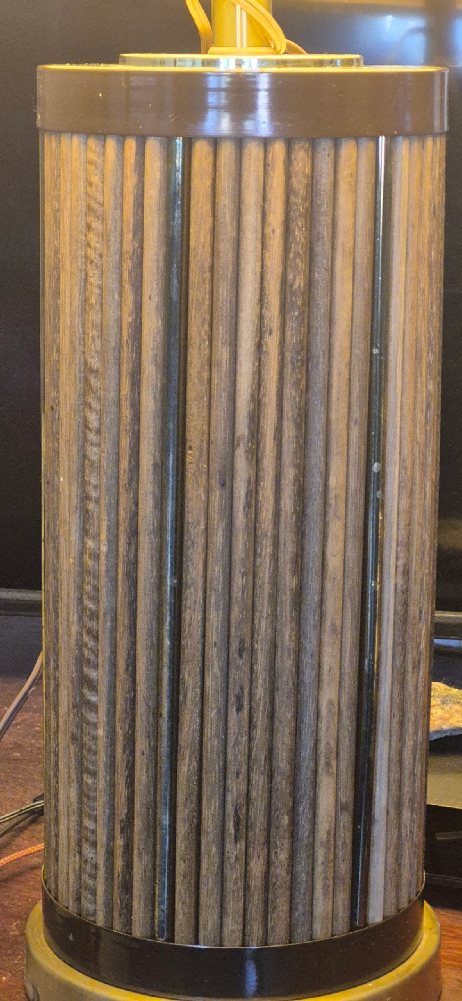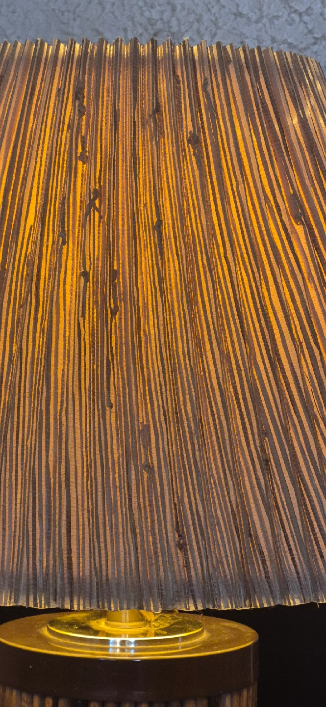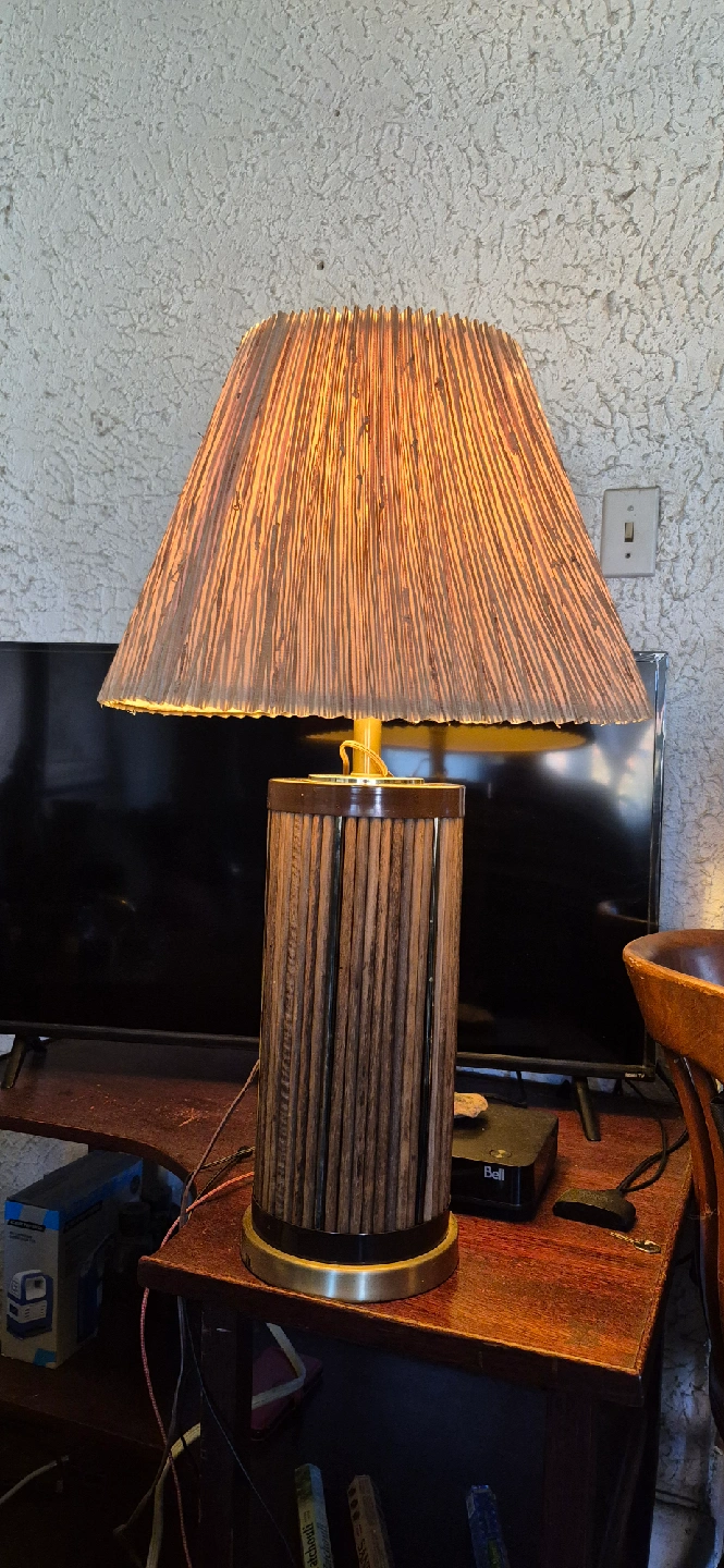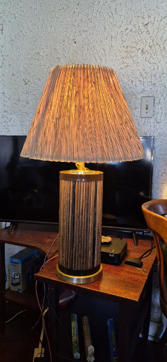 Here's a lovely table lamp with a unique vintage style! It features a wooden base with vertical wooden slats and a pleated lampshade. It would look great in a living room or Den, adding a touch of 1960's retro charm. Solid piece.