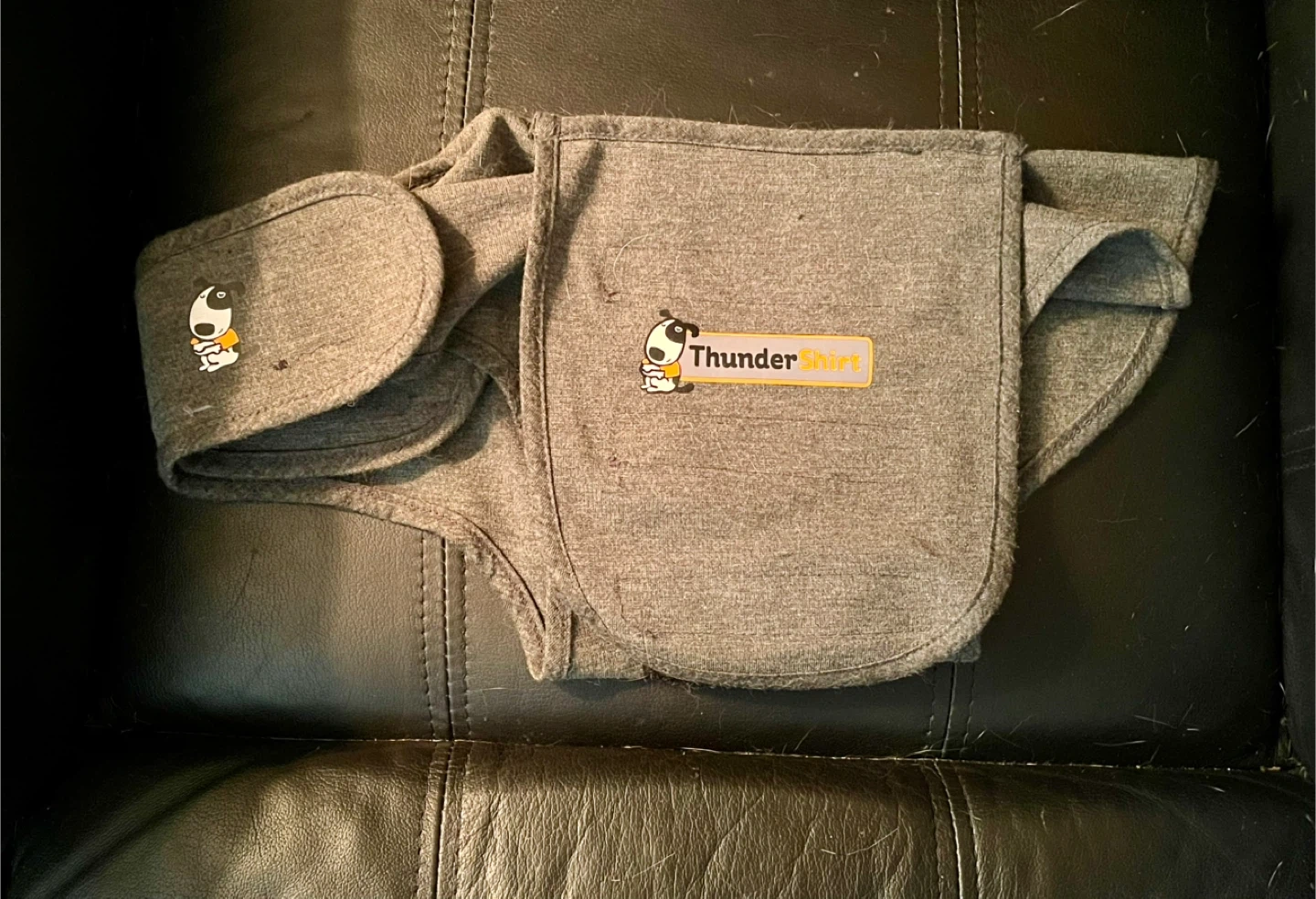 Size small ThunderShirt calming vest for dogs. It's grey and in nearly new condition. This vest helps to reduce anxiety in dogs, especially during thunderstorms or other stressful situations. It applies gentle, constant pressure to calm your dog