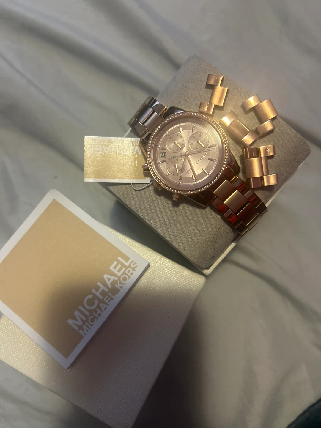 Selling a beautiful Michael Kors watch in rose gold! It comes with its original box and extra links. It's in great condition and ready for a new owner