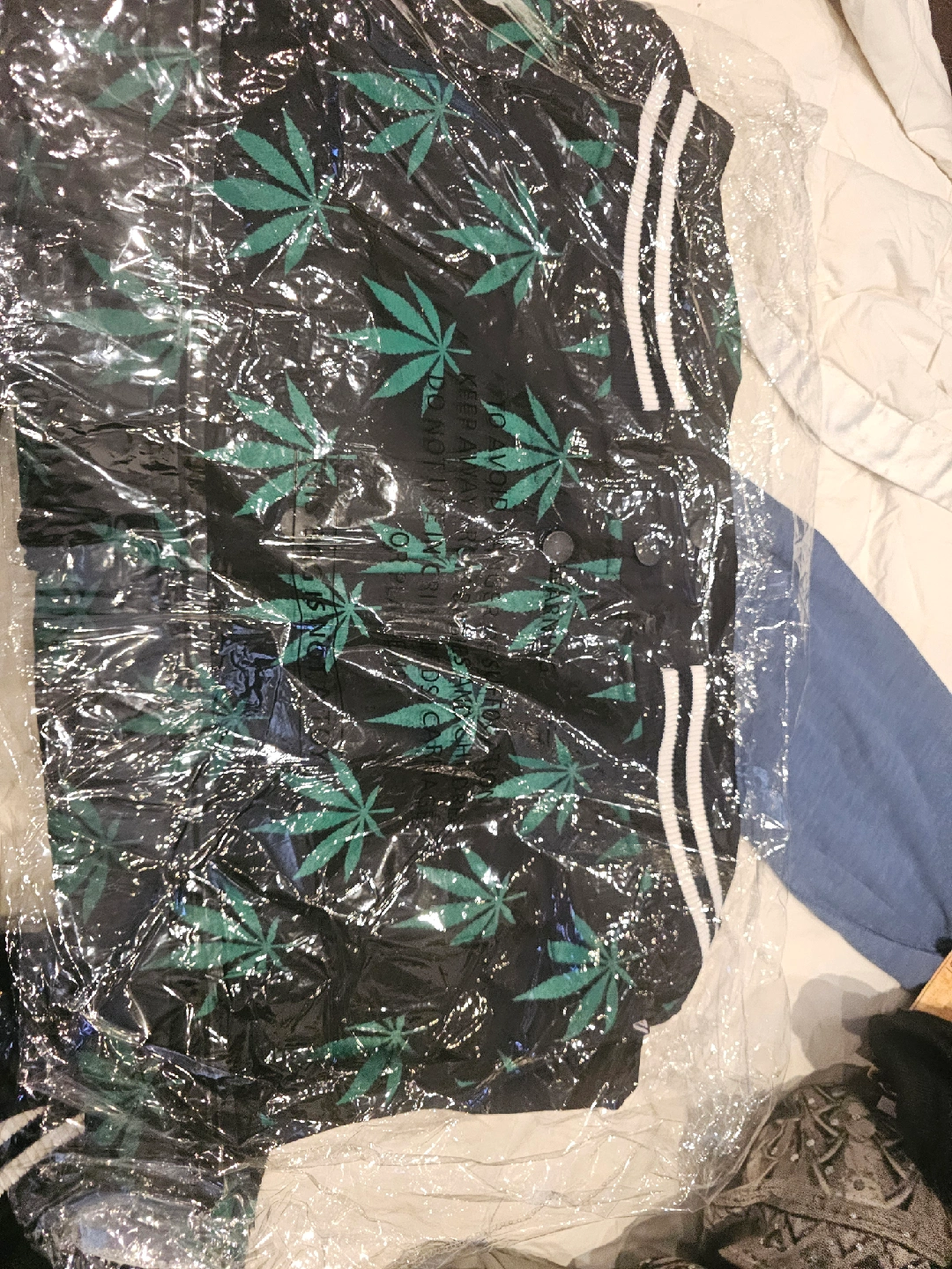 55Selling a varsity jacket with a unique leaf print. It's still in its original packaging, so it's brand new! The jacket features a black base with green leaf designs and white stripes on the sleeves. Perfect for adding a touch of style to your wardrobe