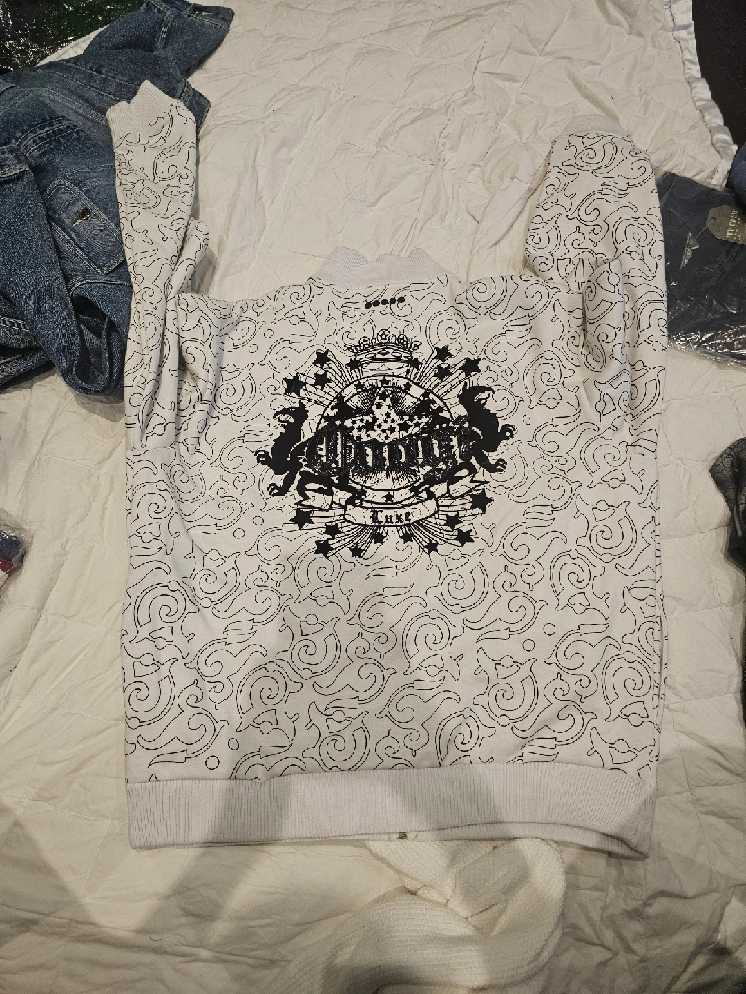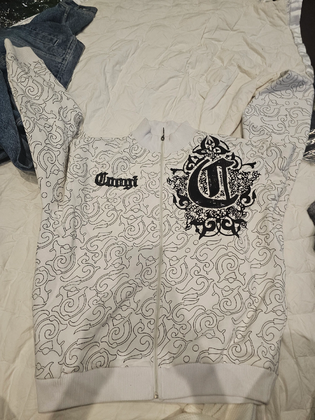 55Selling a stylish Clungi zip-up jacket with a unique white pattern! The jacket features a distinctive design on both the front and back, making it a standout piece. It's perfect for adding a touch of flair to your wardrobe