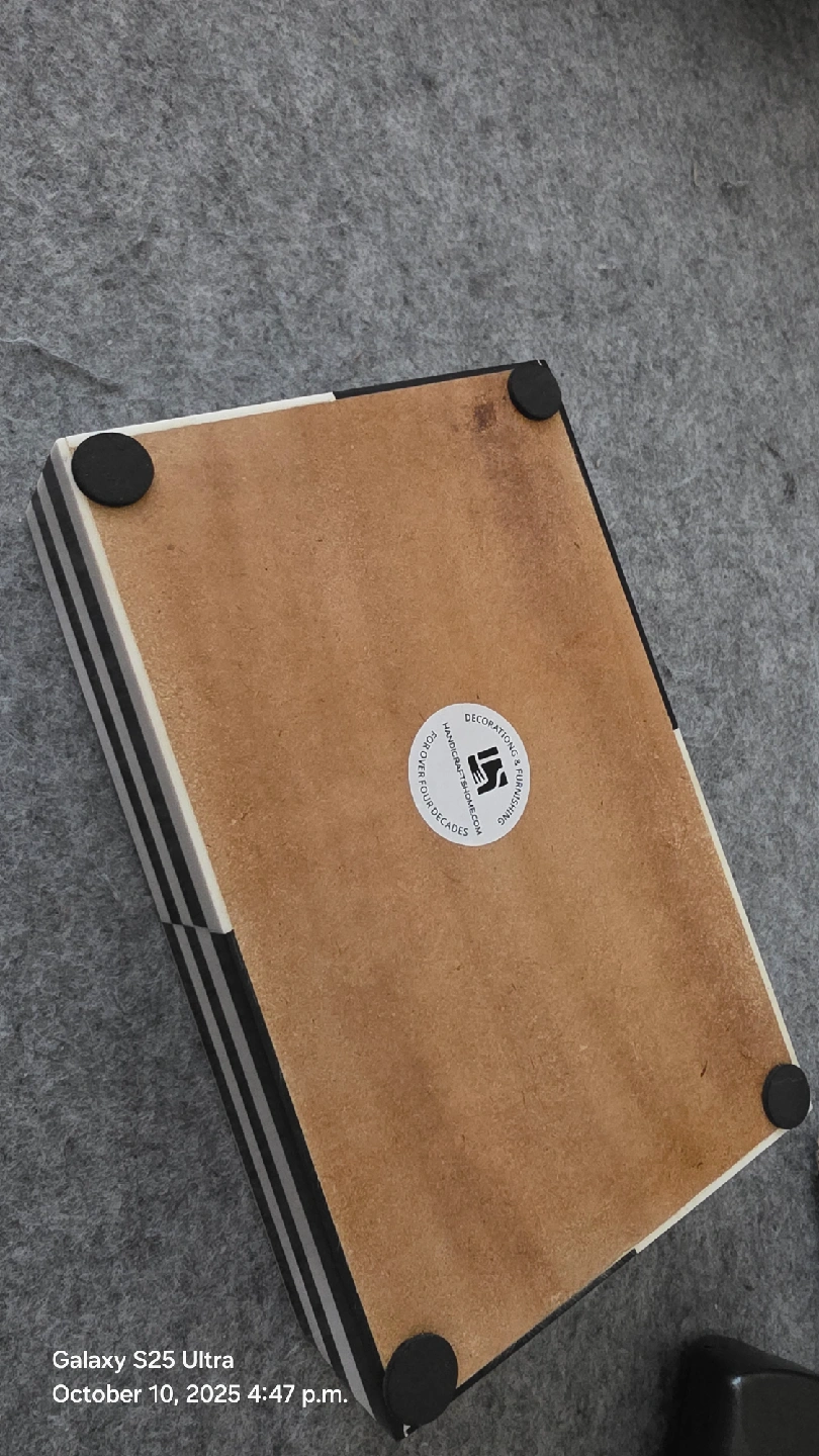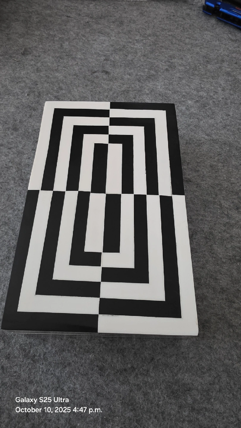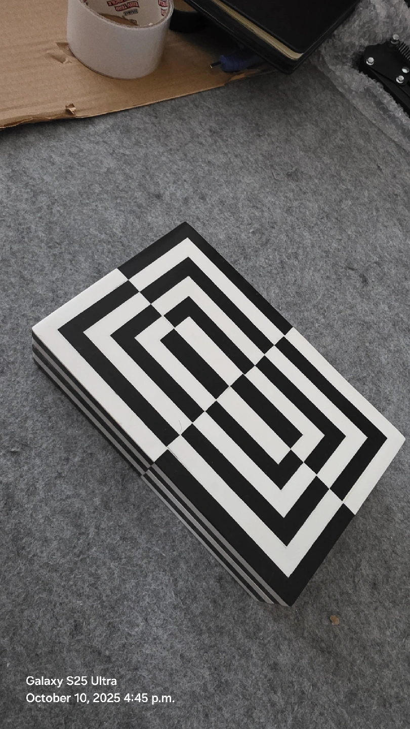 Selling a handmade wooden decorative box! It features a striking black and white geometric pattern on the lid. The box is in good condition and perfect for storing small items or as a decorative piece in your home.