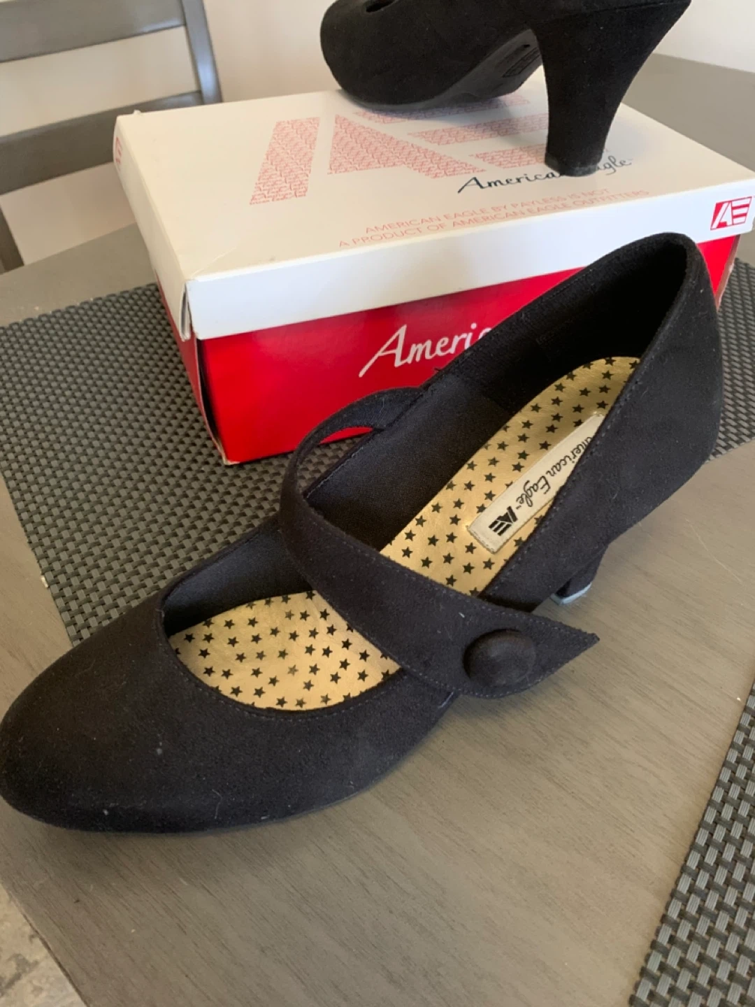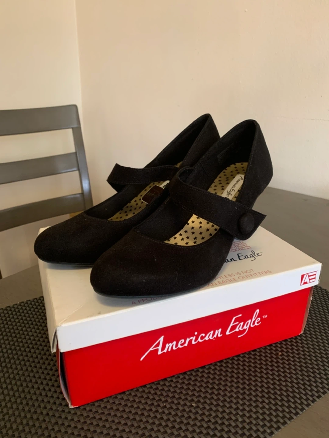 Selling a pair of American Eagle black heels in size 9. These stylish heels come in their original box and feature a cute Mary Jane style strap. Perfect for dressing up any outfit!