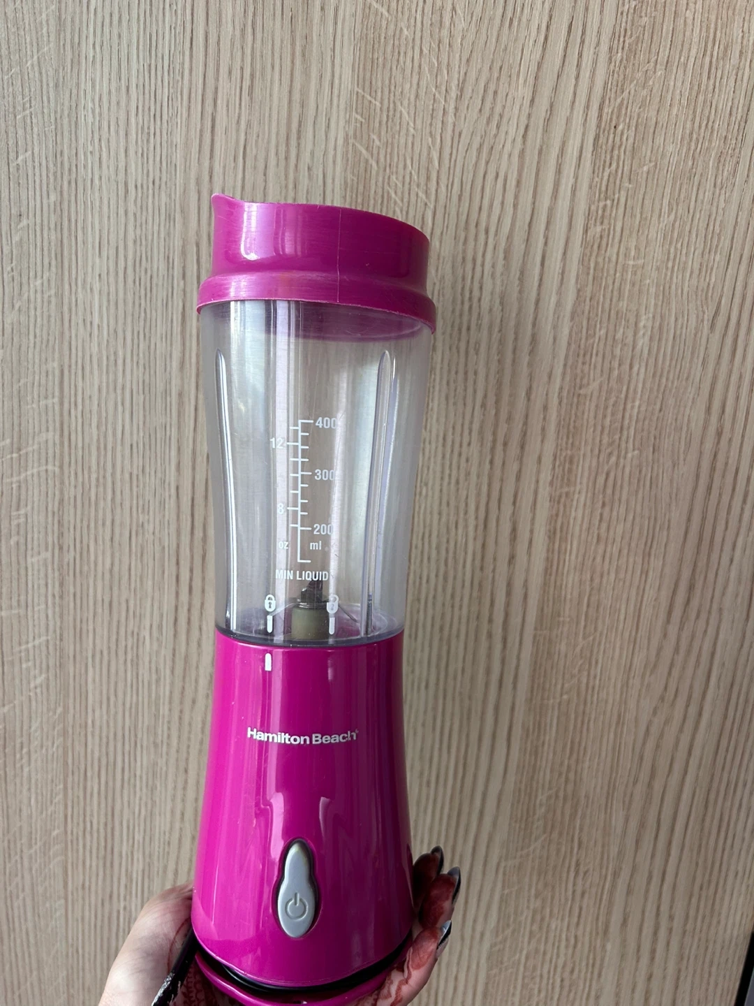 Selling a Hamilton Beach personal blender in a vibrant pink colour! It's perfect for making smoothies and shakes on the go. It has measurement markings on the side and a convenient power button