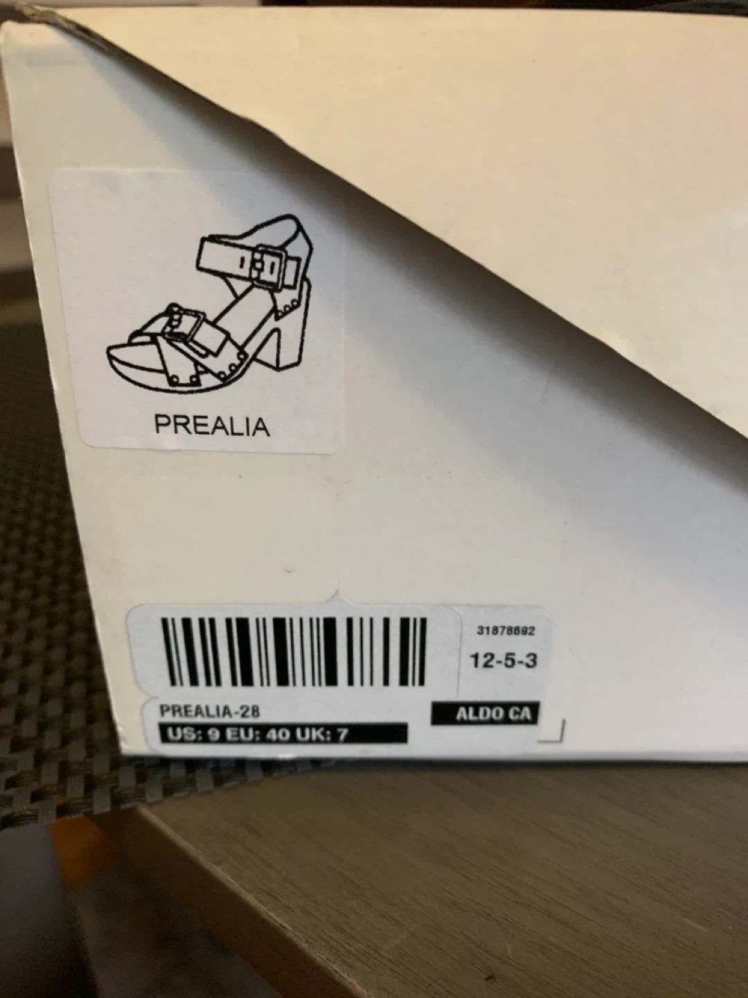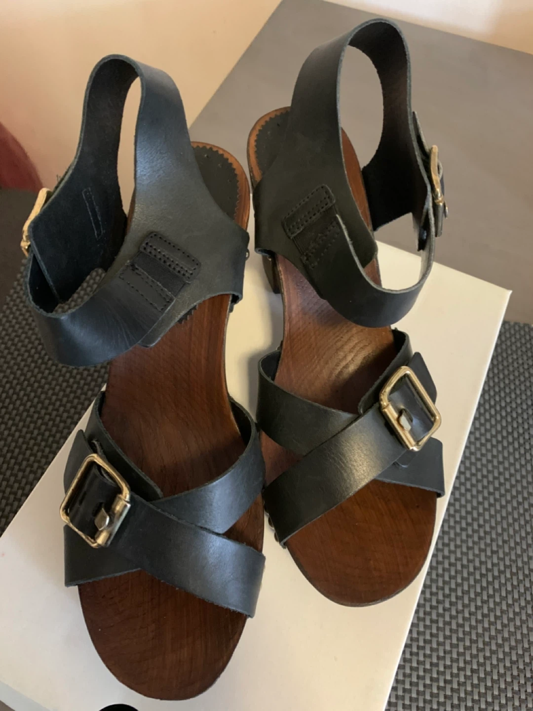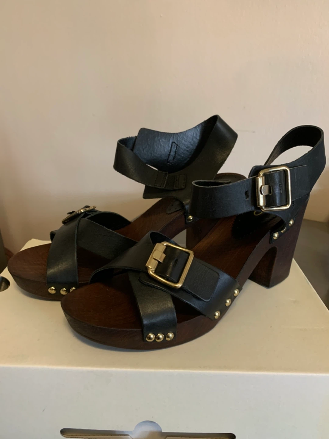 These are a pair of Aldo heeled sandals with a black leather upper and wooden sole. They feature adjustable straps with gold-tone buckles and stud detailing. Comes with the original box!