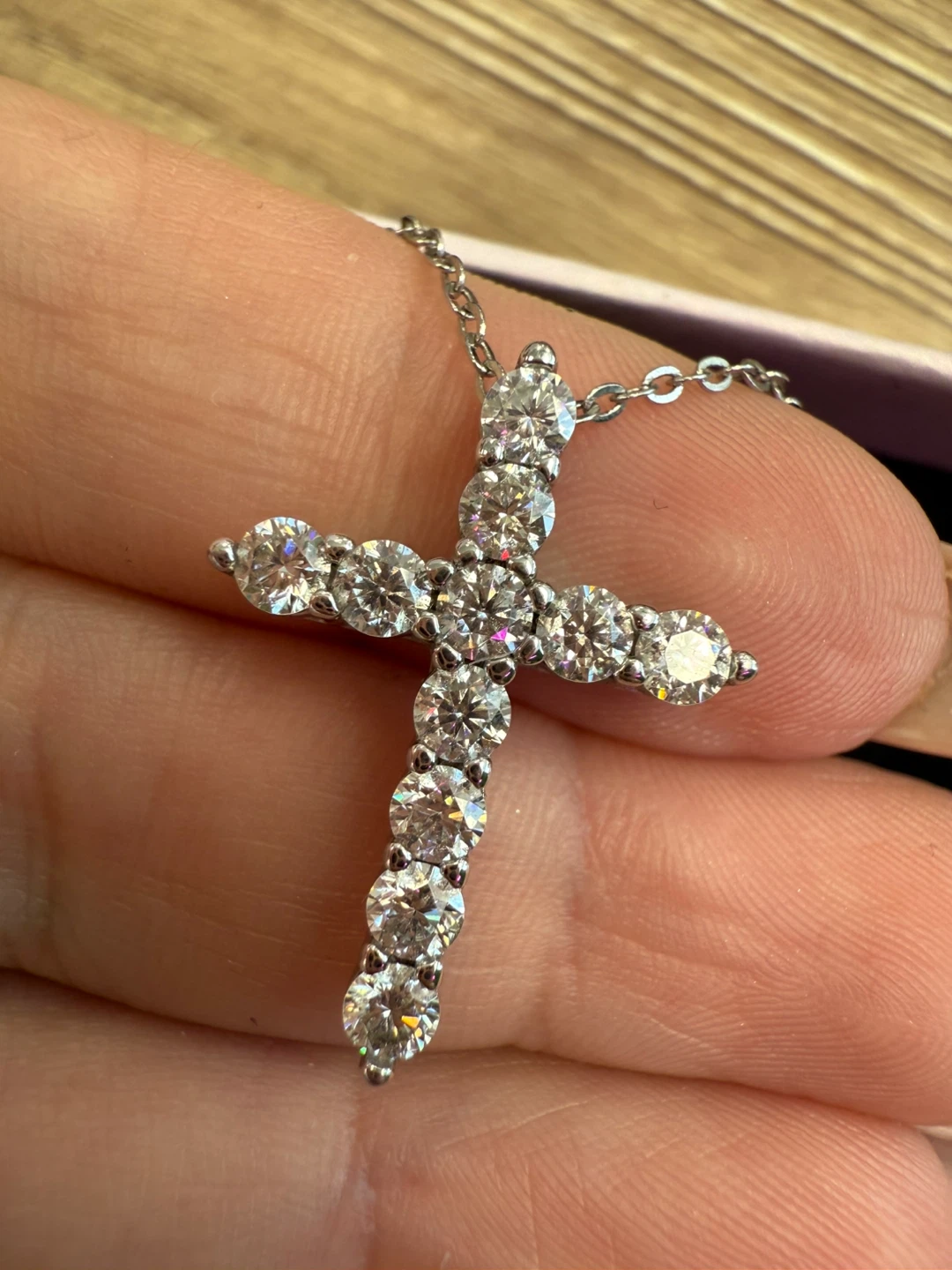 Selling a lovely Tiffany style cross pendant necklace! It features a silver chain and a cross pendant adorned with sparkling moissanites. It comes in a box, ready to be gifted or worn. A beautiful accessory to add a touch of elegance to any outfit.