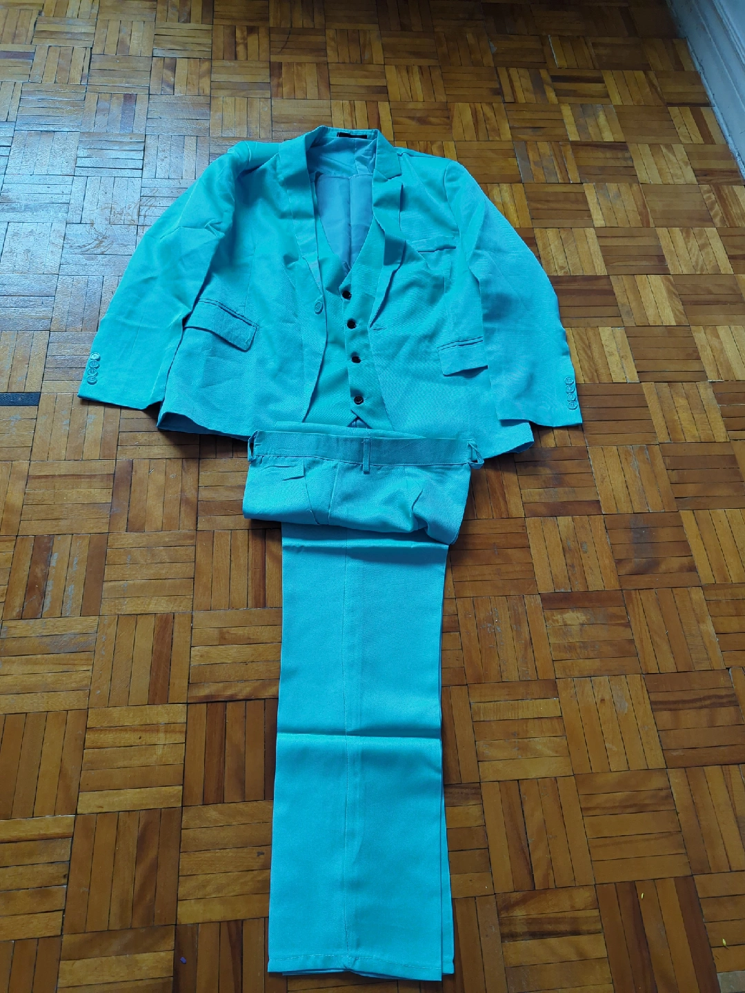 Selling a men's 3-piece suit in a unique teal colour! It includes a jacket, vest, and pants. Perfect for a special occasion or adding a pop of colour to your wardrobe