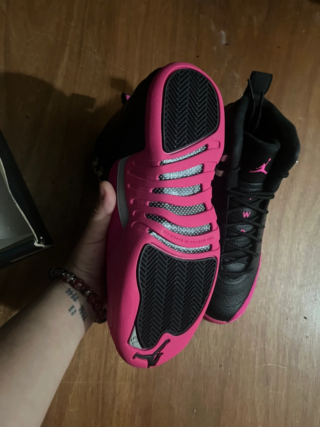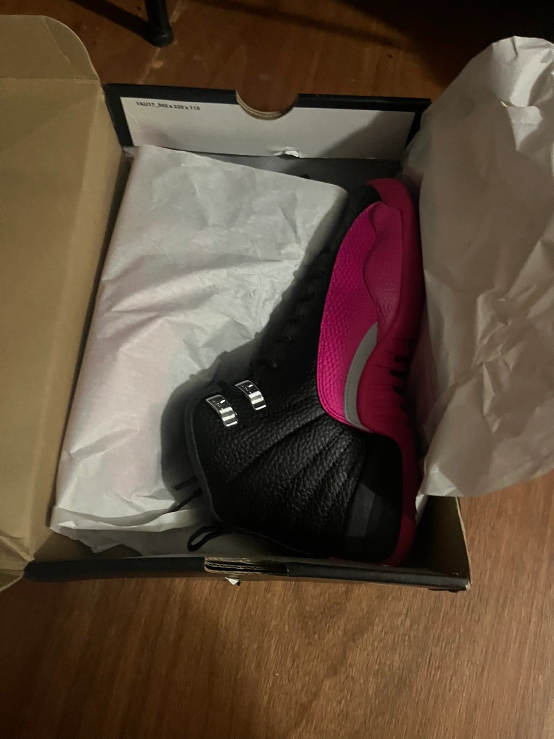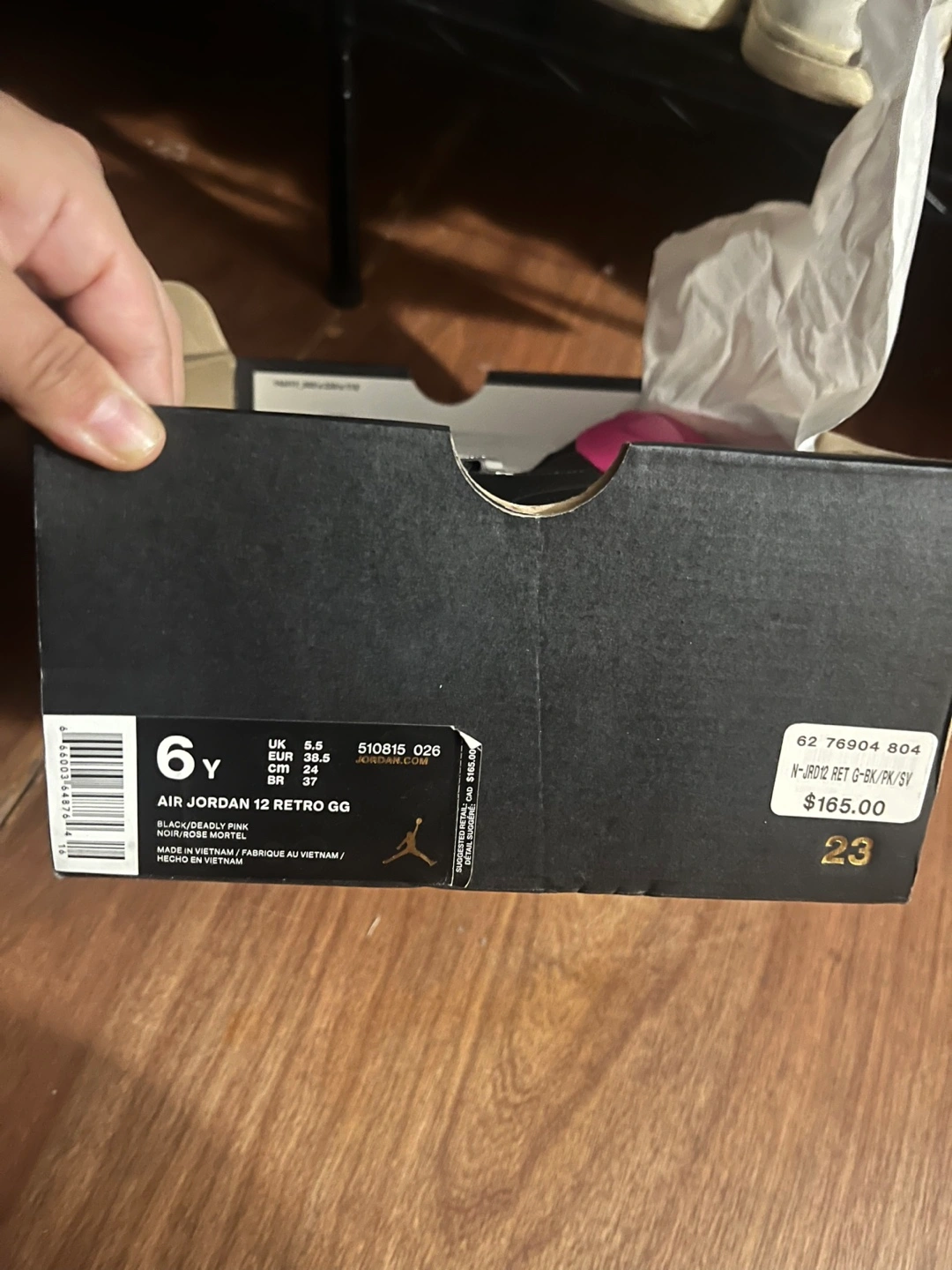 Selling a pair of Air Jordan 12 Retro GG sneakers in black and pink, size 6Y. They come with the original box and are in perfect condition. Box is a little squished