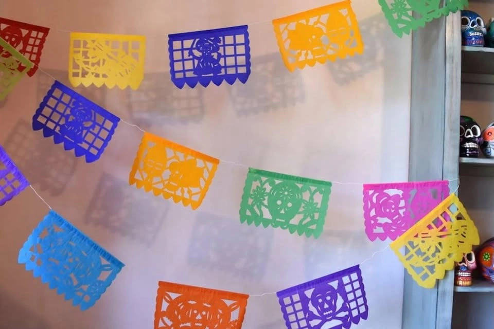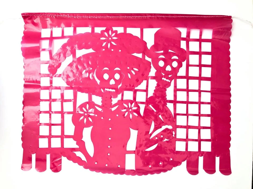 Dia de Muertos in Mexican culture. These were imported from Mexico and are very cool, unique items that are very hard to find. Each flag has a different design and colour. Made of die cut plastic, these will last several years compared to the typical paper version. These are big flags, about 18” long and 12” tall each, and each banner comes with 10 flags. So the total length of the banners are over 15 feet, or 5 meters! This would be amazing for a themed Coco party.