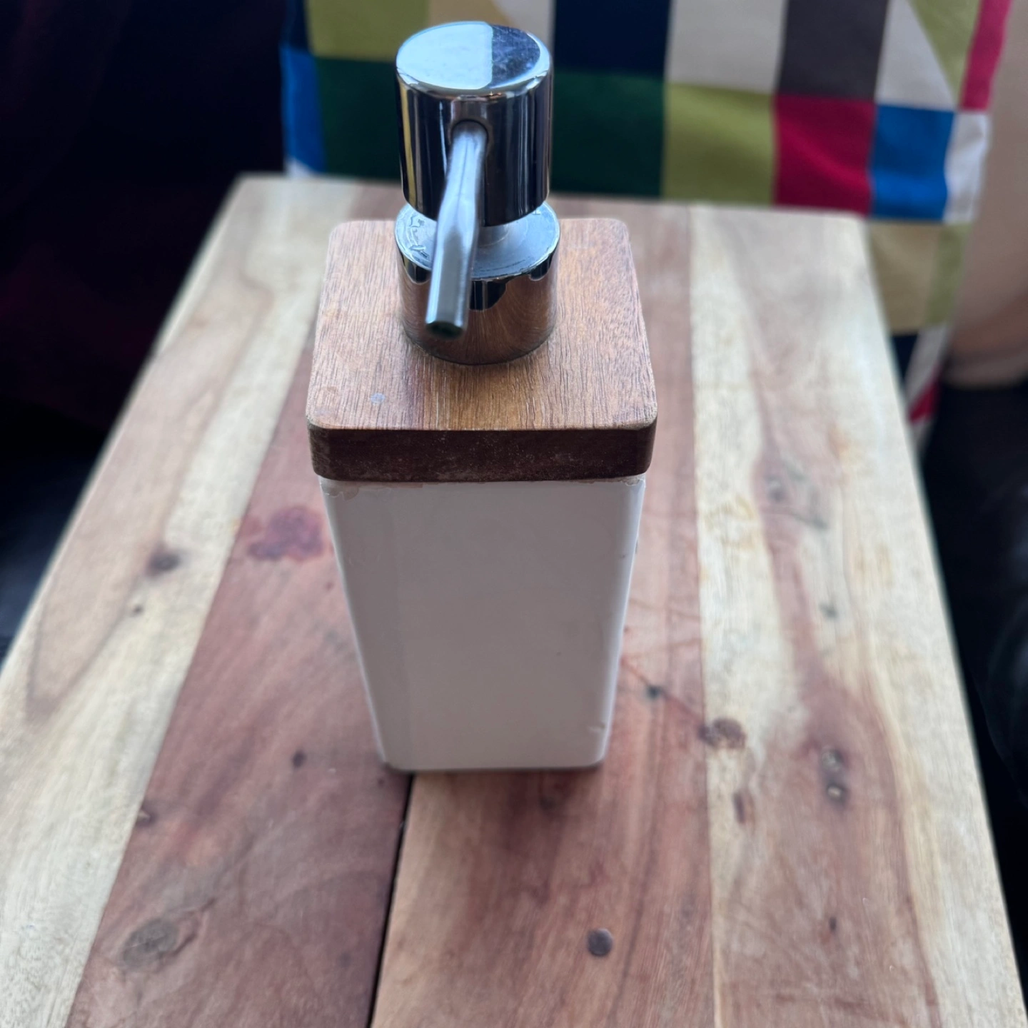 180Selling a soap dispenser with a white ceramic base and a wood-look top. It has a chrome pump. It's in ok condition and ready to use in your bathroom or kitchen.