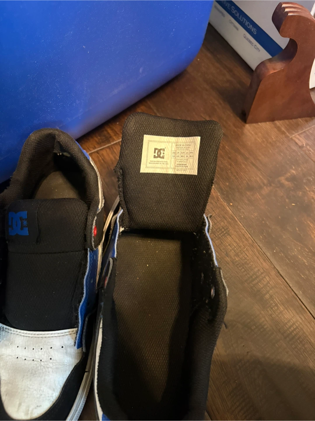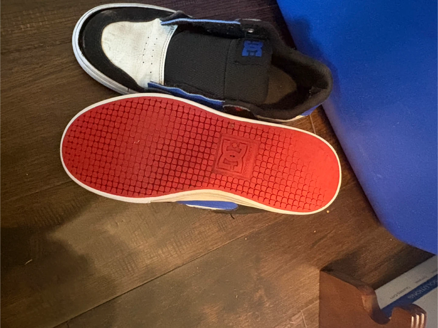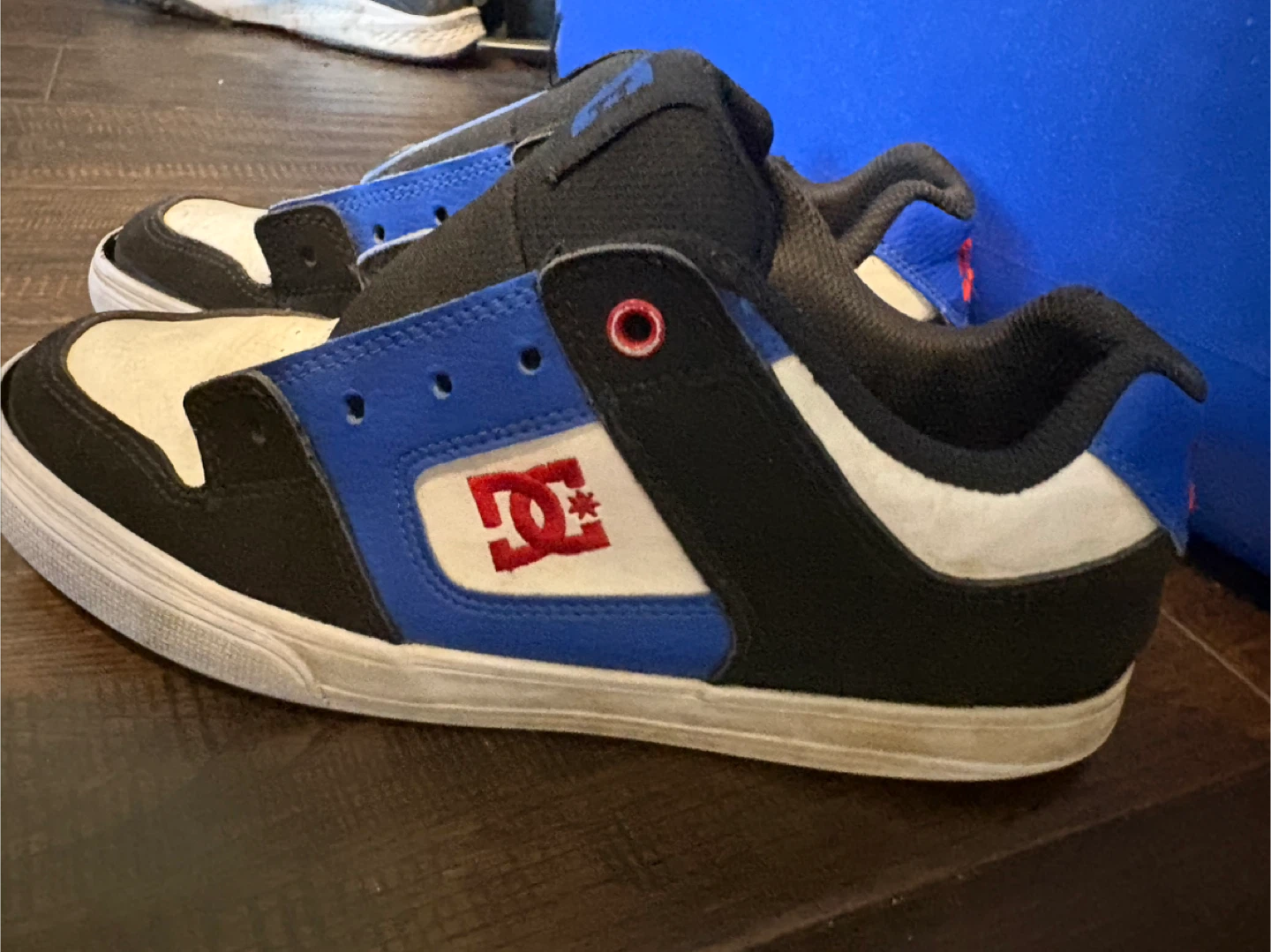 Selling a pair of Boys DC shoes in white, blue, and black. They are in used condition, but still have lots of life left. Size 5.