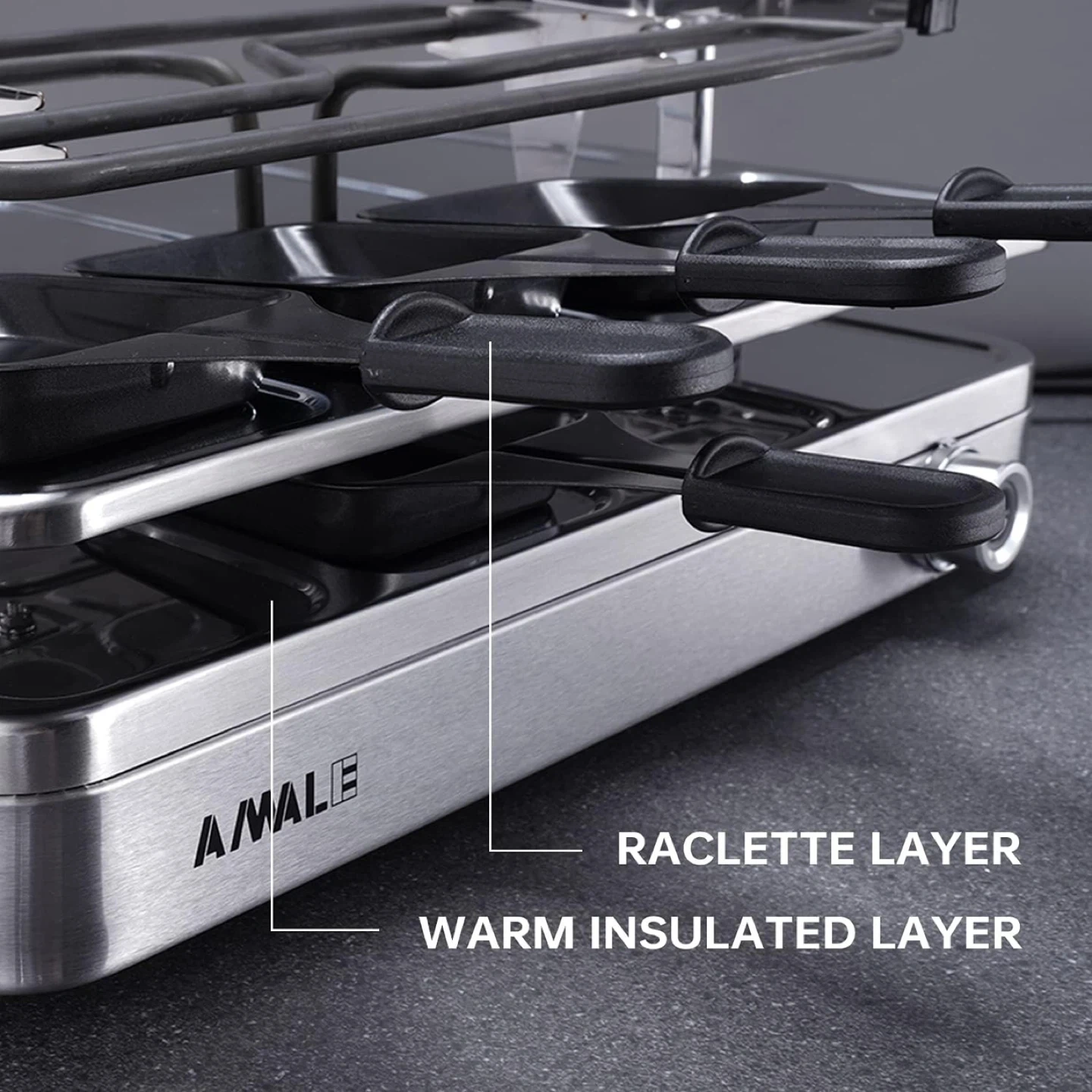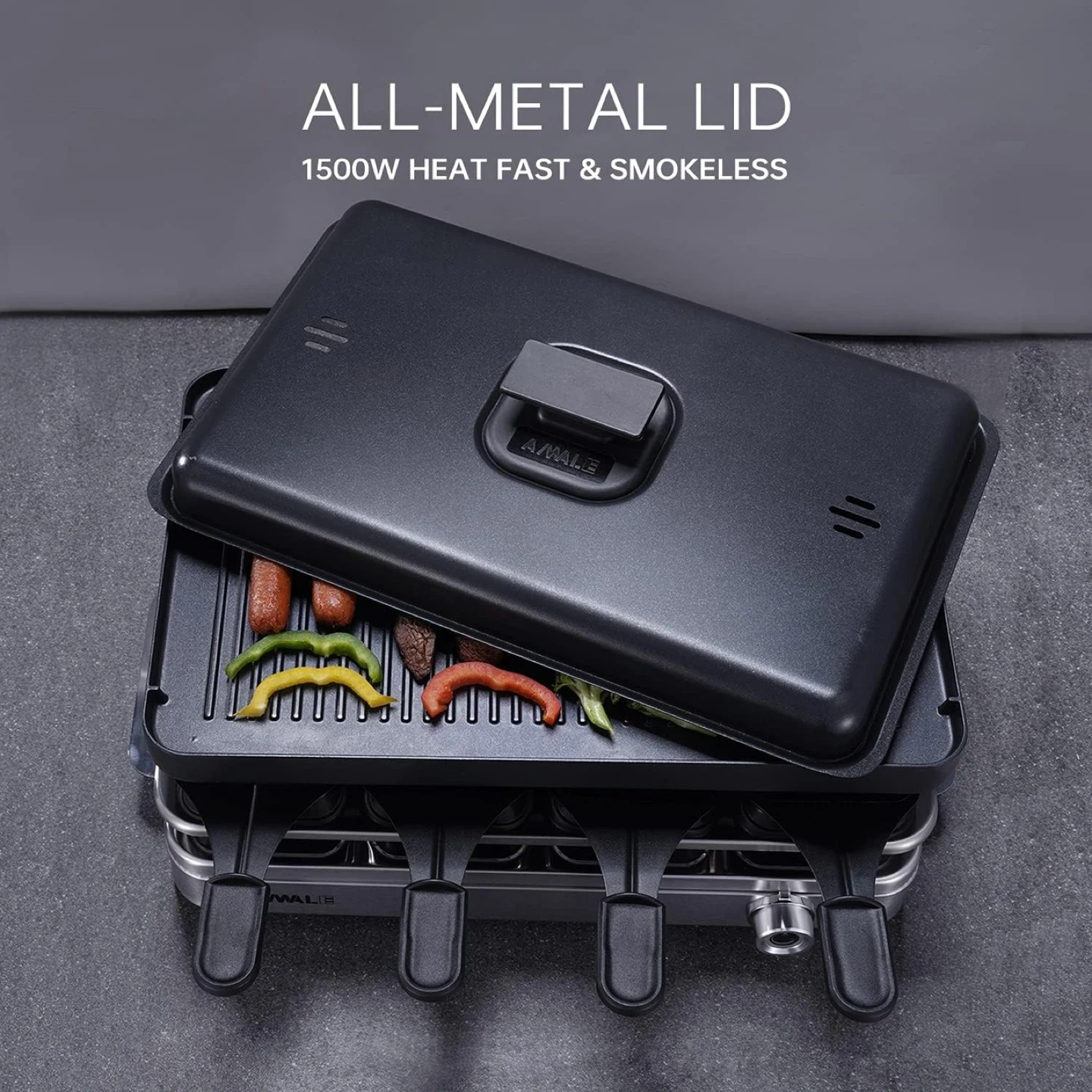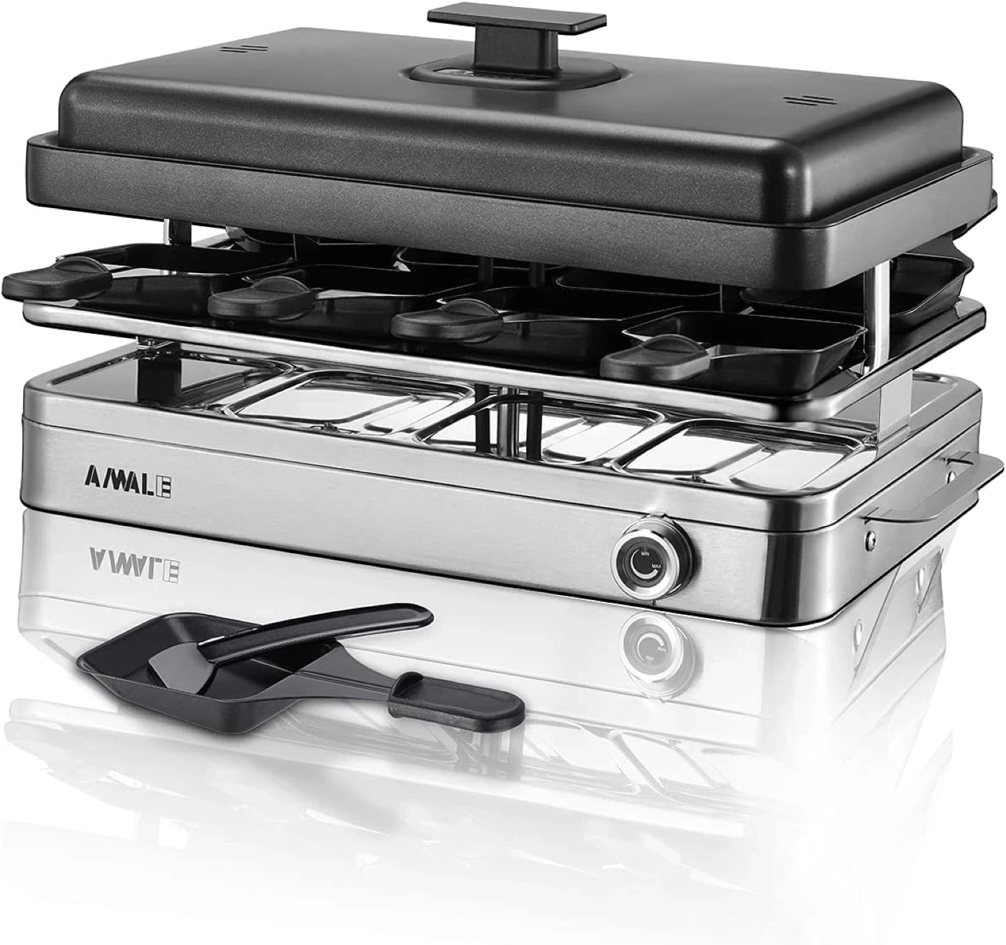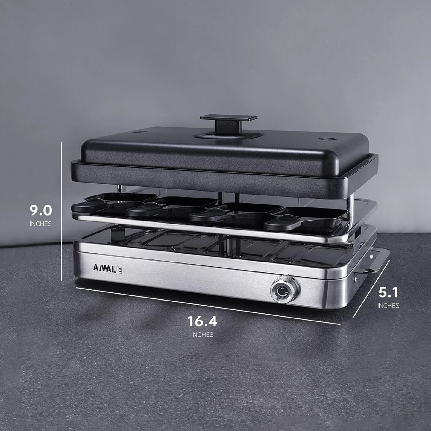 102Selling an Amale raclette grill! It's 16.4 inches wide, 9 inches tall, and 5.1 inches deep. It has a 2-in-1 reversible deep plate that is non-stick and dishwasher safe. The lid is all-metal and smokeless, and heats fast with 1500W