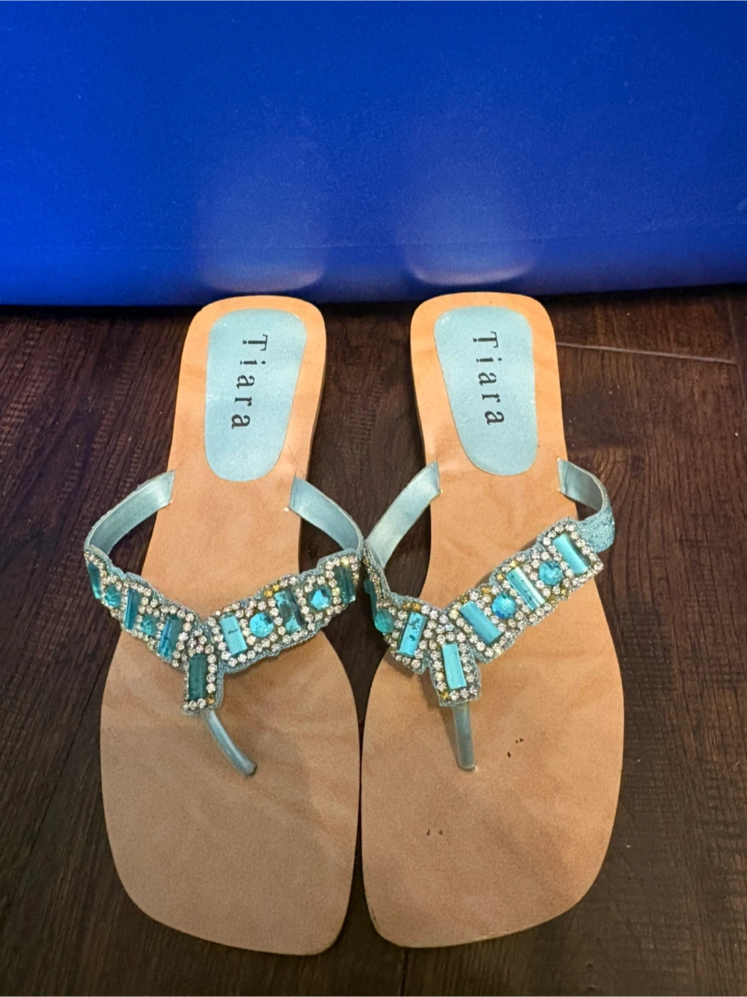 These are a pair of Tiara flip flops with pretty blue beading. They're perfect for summer and adding a bit of sparkle to your outfit! SIZE 9