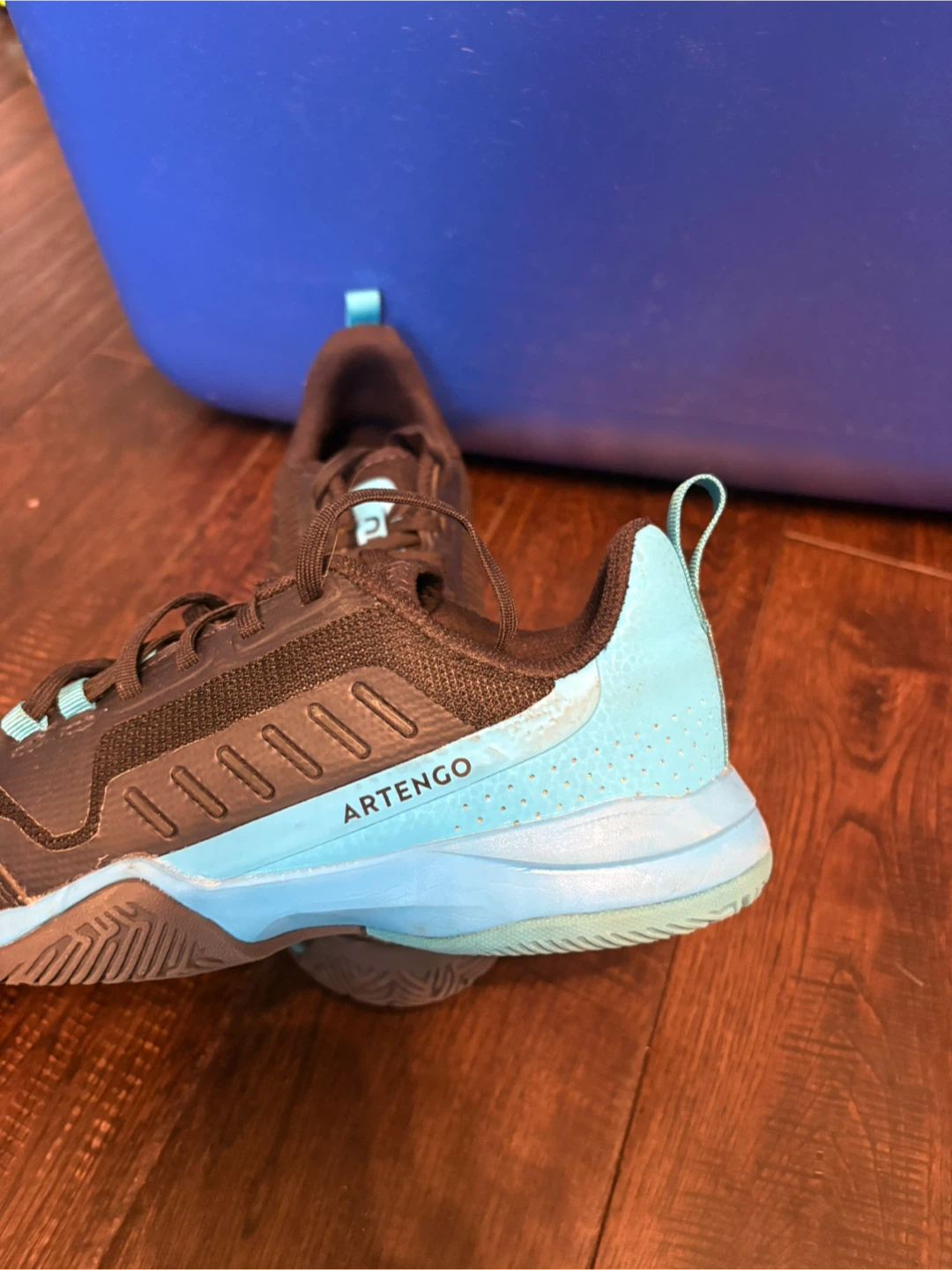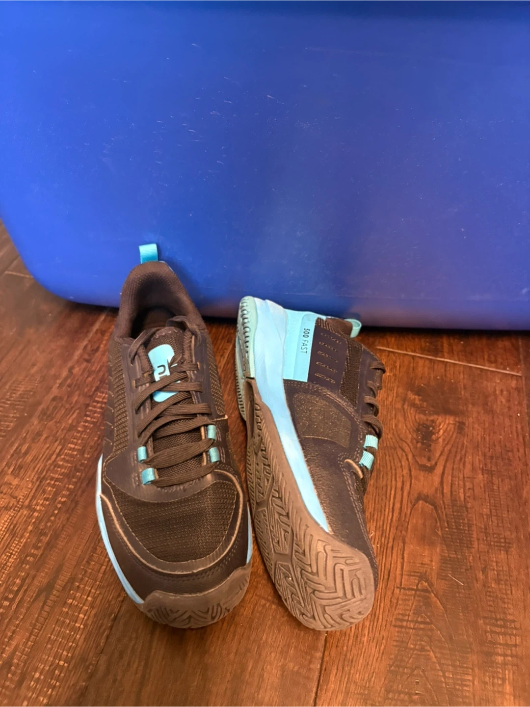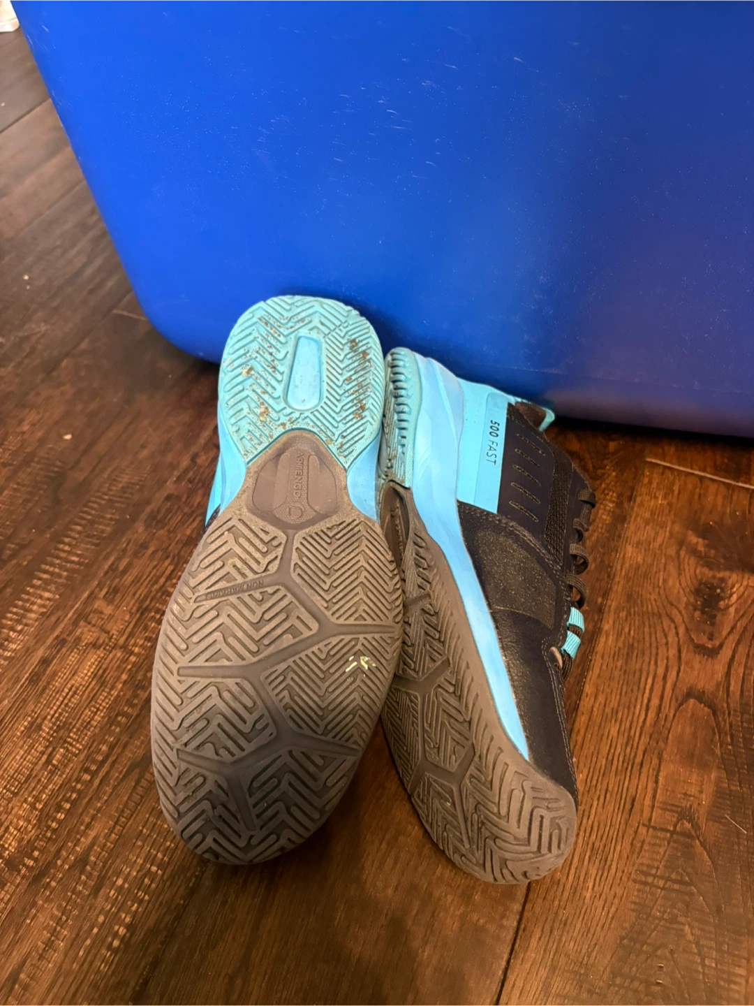 Selling a pair of Artengo 500 Fast tennis shoes in size 5 boys . They're in good condition and ready for the court! The shoes are black with light blue accents.