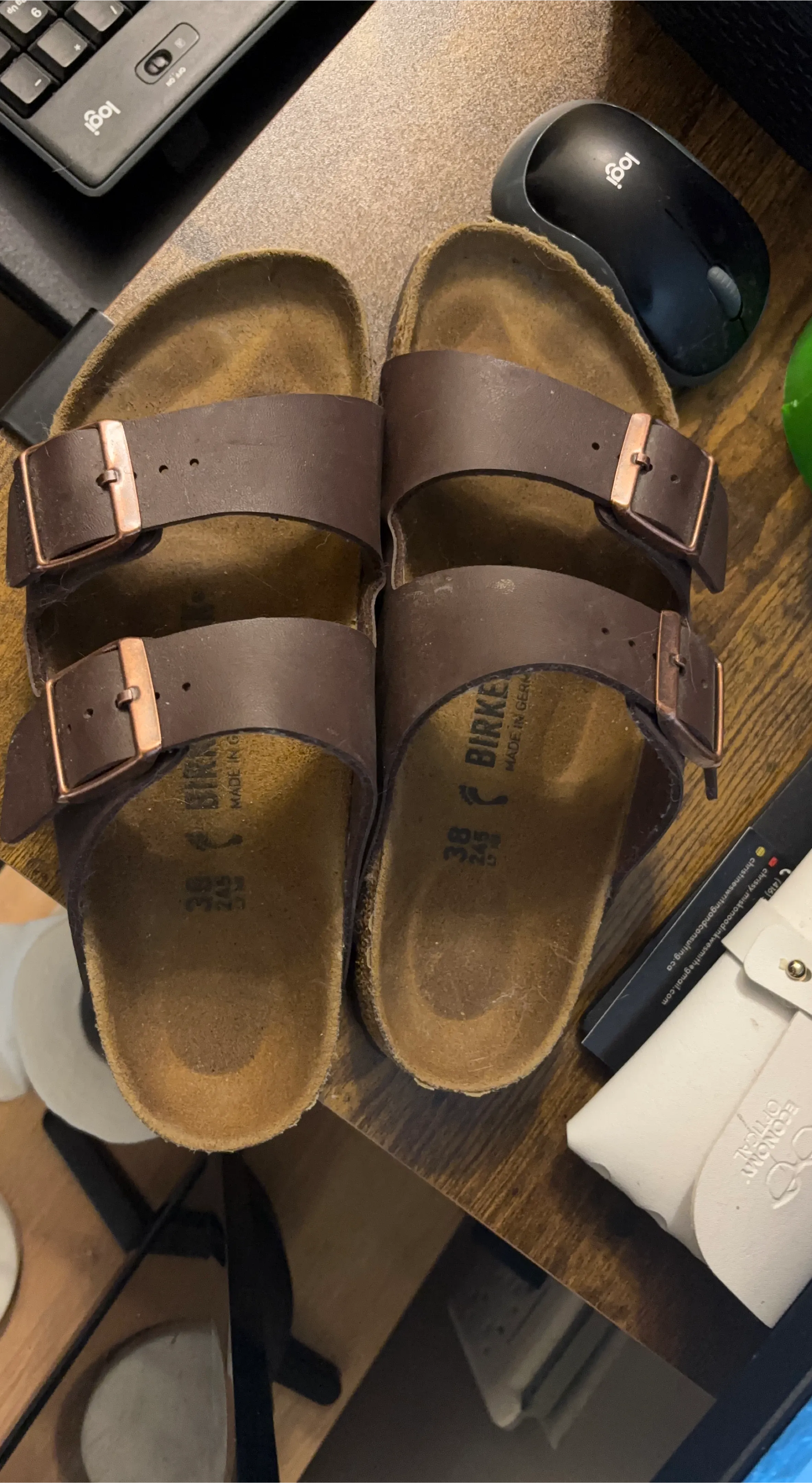 Must Go!-Selling a pair of Birkenstock Arizona sandals in size 38, which is about a US size 7 to 7.5. These are a dark brown colour with copper-toned buckles. They're in good condition and ready for a new home! Pick up only.