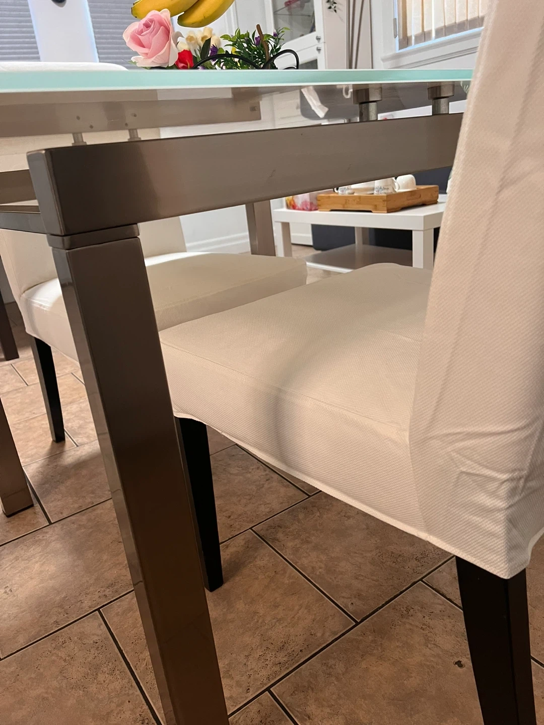 90cm square table has extra-thick glass top with heavy-duty stainless steel legs — extremely solid and high quality (very heavy, two people needed to move) Includes 2 soft padded chairs with brand new covers. Free delivery nearby.