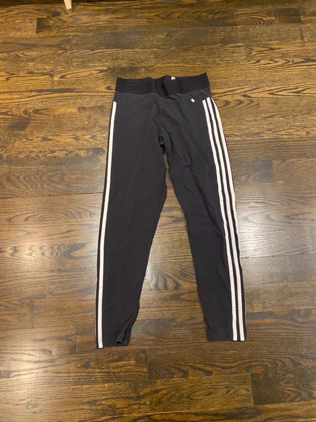 Black Adidas jogging pants with classic white stripes down the sides. Elastic waistband for a comfortable fit. Great for casual wear or athletic activities.