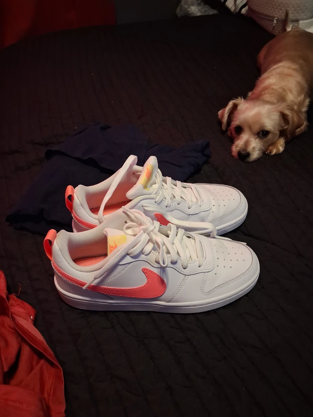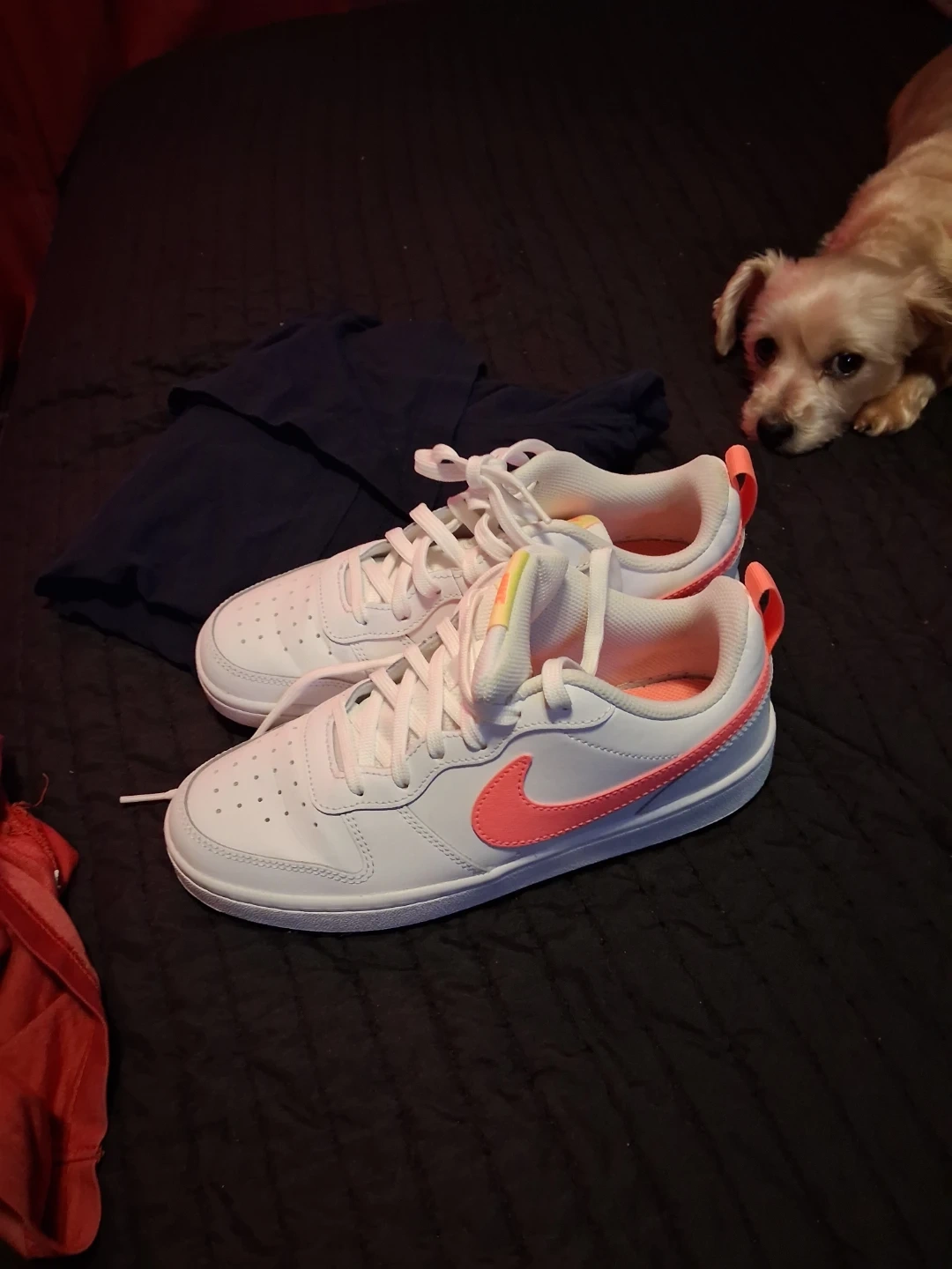 Classic Nike Court Vision Low sneakers. White leather with coral pink swoosh and accents. Lace-up closure. Comfortable for everyday wear. Size 6 youth
