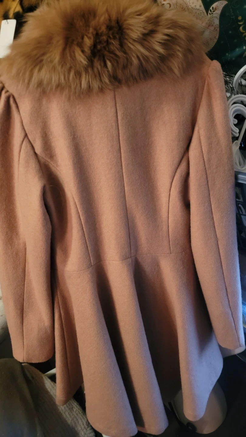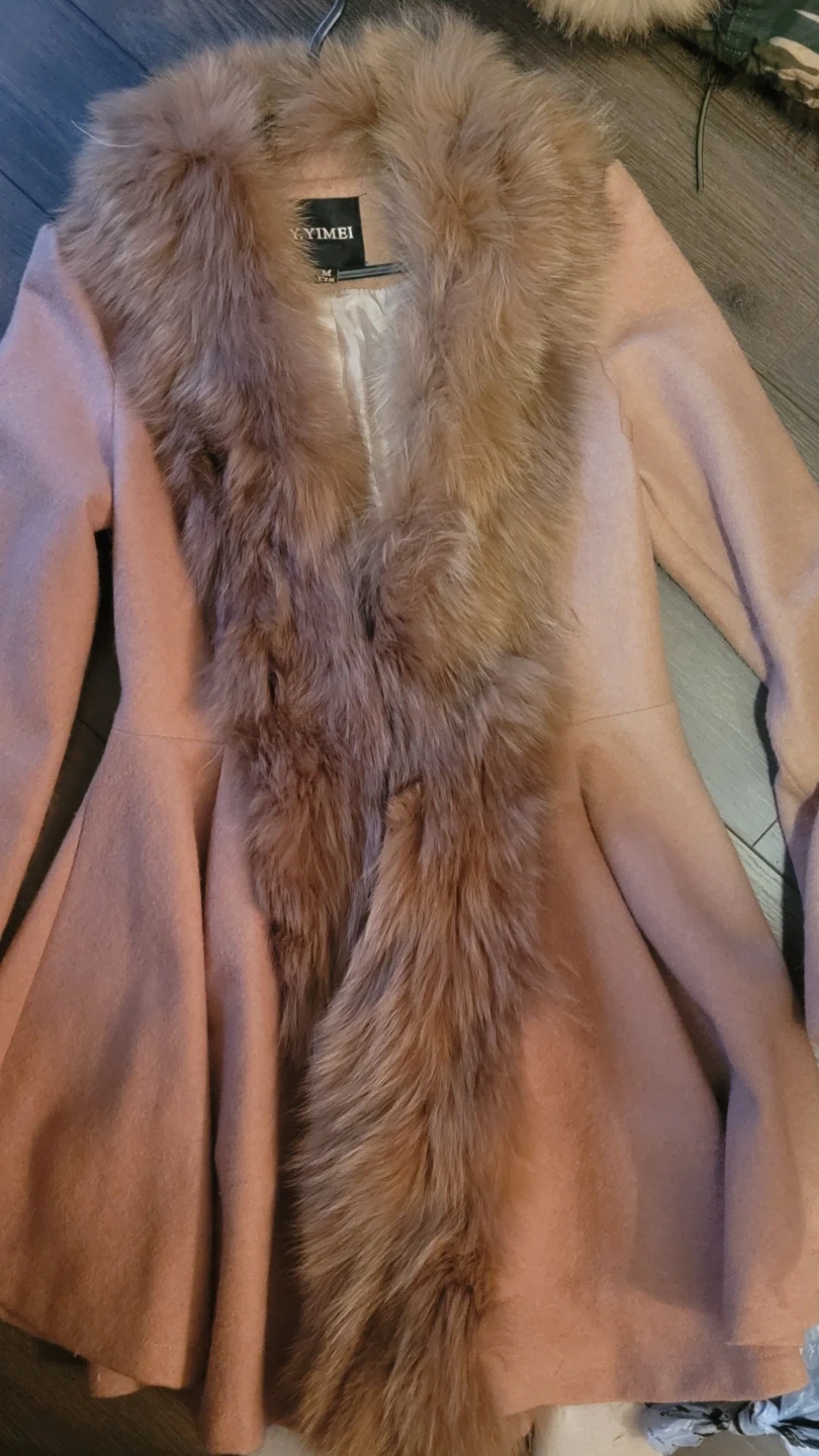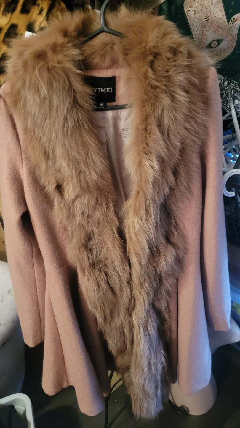 This YIYIMEI coat is a lovely light pink colour with a plush real fur collar trim. Its a size medium. This stylish coat will keep you warm and looking chic!