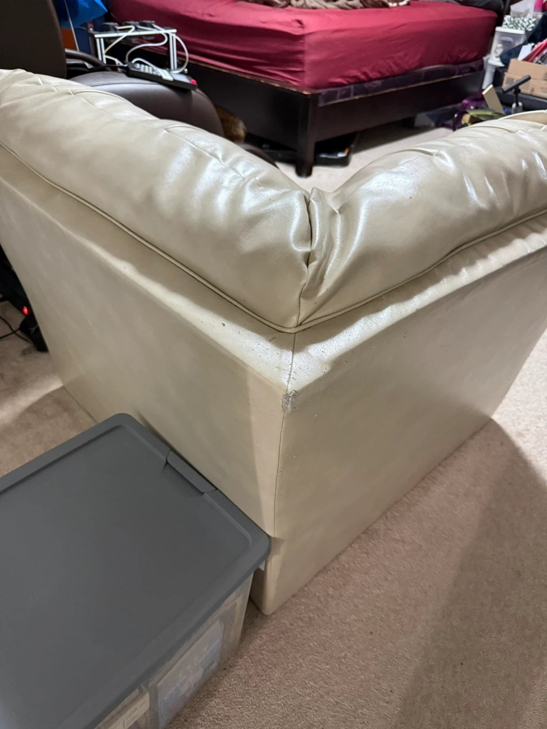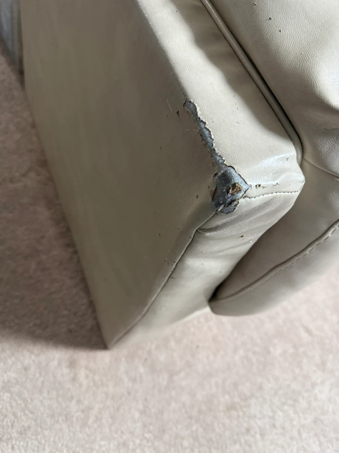 Cream coloured corner chair with a faux leather finish. There's some wear and tear on the corners. It's a comfy addition to any living space.
