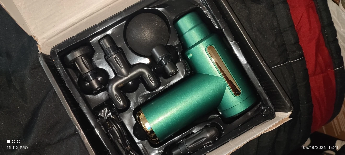 This mini massage gun comes in a vibrant green colour and includes multiple attachments for targeted muscle relief. It's designed for quiet operation and has a long-lasting battery. This device is useful for post-workout recovery or everyday muscle tension relief.