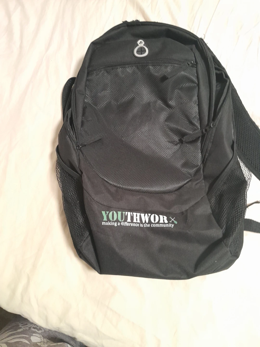 This is a black YOUTHWORK backpack. It's made of nylon material and has multiple compartments, including mesh side pockets. It's suitable for school or everyday use.