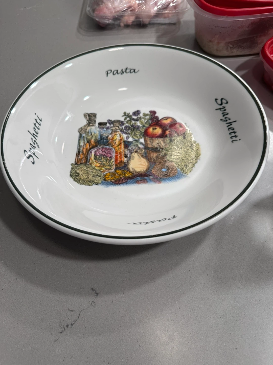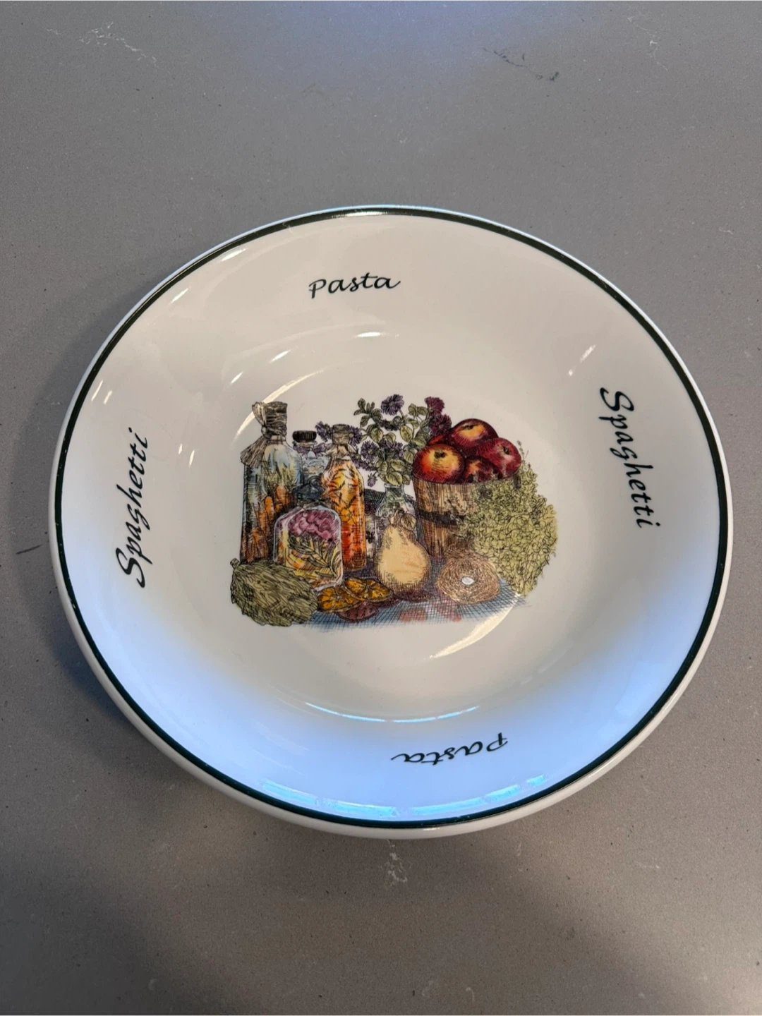 A white ceramic bowl featuring a charming Italian-themed illustration of pasta ingredients. It has 'Pasta' and 'Spaghetti' printed around the rim. This bowl is perfect for serving your favourite pasta dishes!