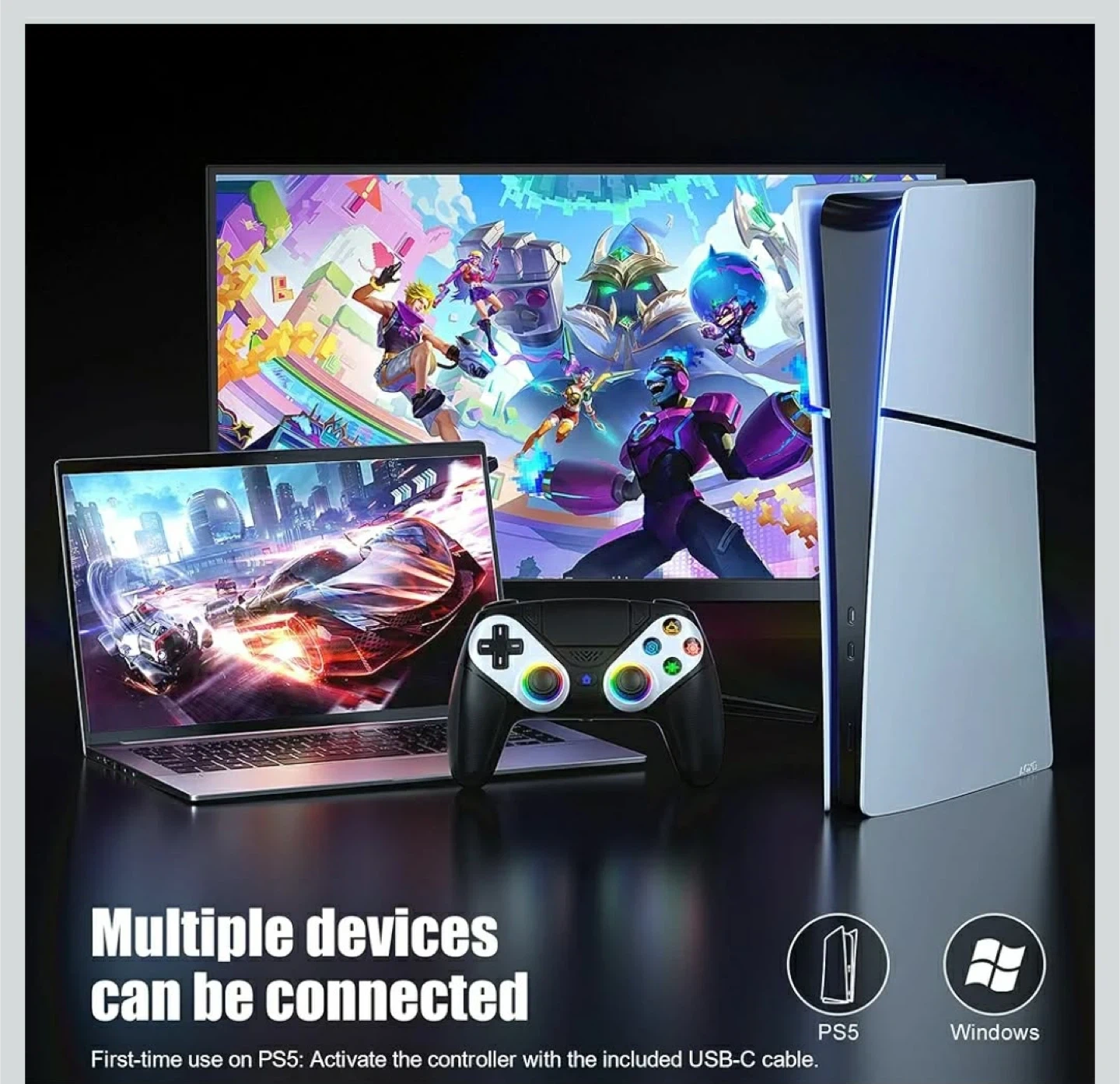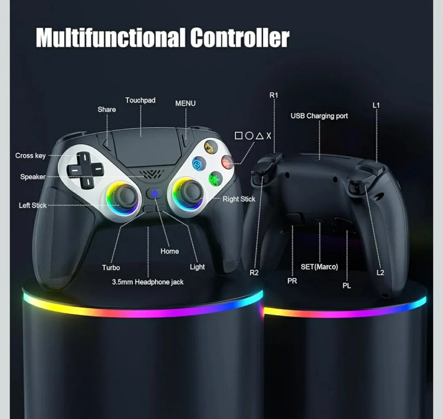 This multifunctional gaming controller offers an ultimate gaming experience. It features dual motor vibration feedback and sensitive 6-axis somatosensory. The controller supports seven light colours and three light modes, plus a colour memory function. It also has a 3.5mm headphone jack and a USB charging port.