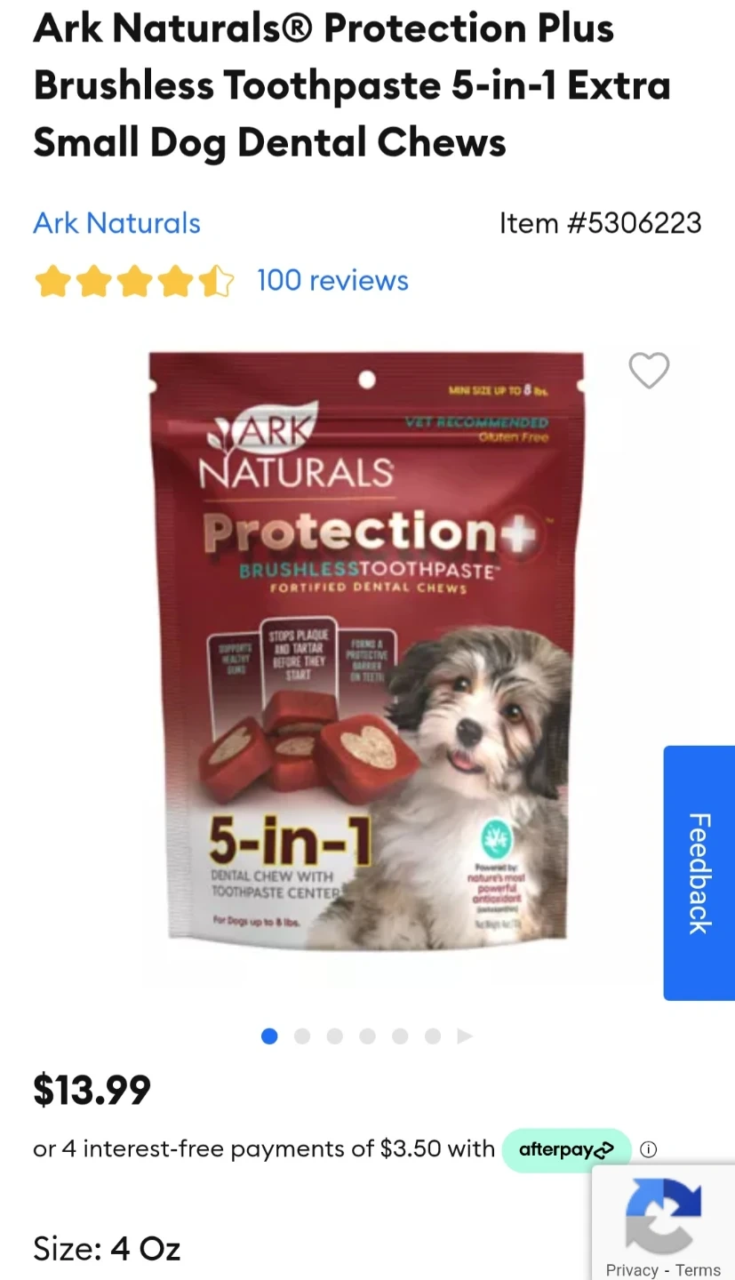 Ark Naturals Protection Plus 5-in-1 dental chews for small dogs. These fortified dental chews stop plaque and tartar. They're vet recommended and gluten-free. Made for dogs up to 8 lbs.
